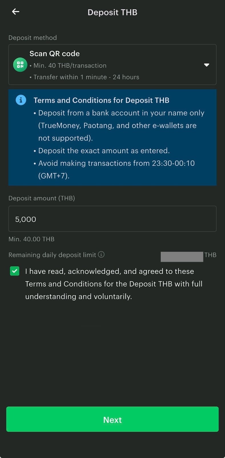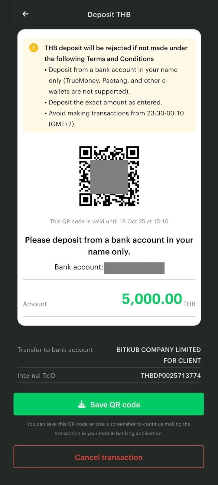 4. You can choose between the two options to deposit THB (Scan QR code or Deposit and Upload slip).