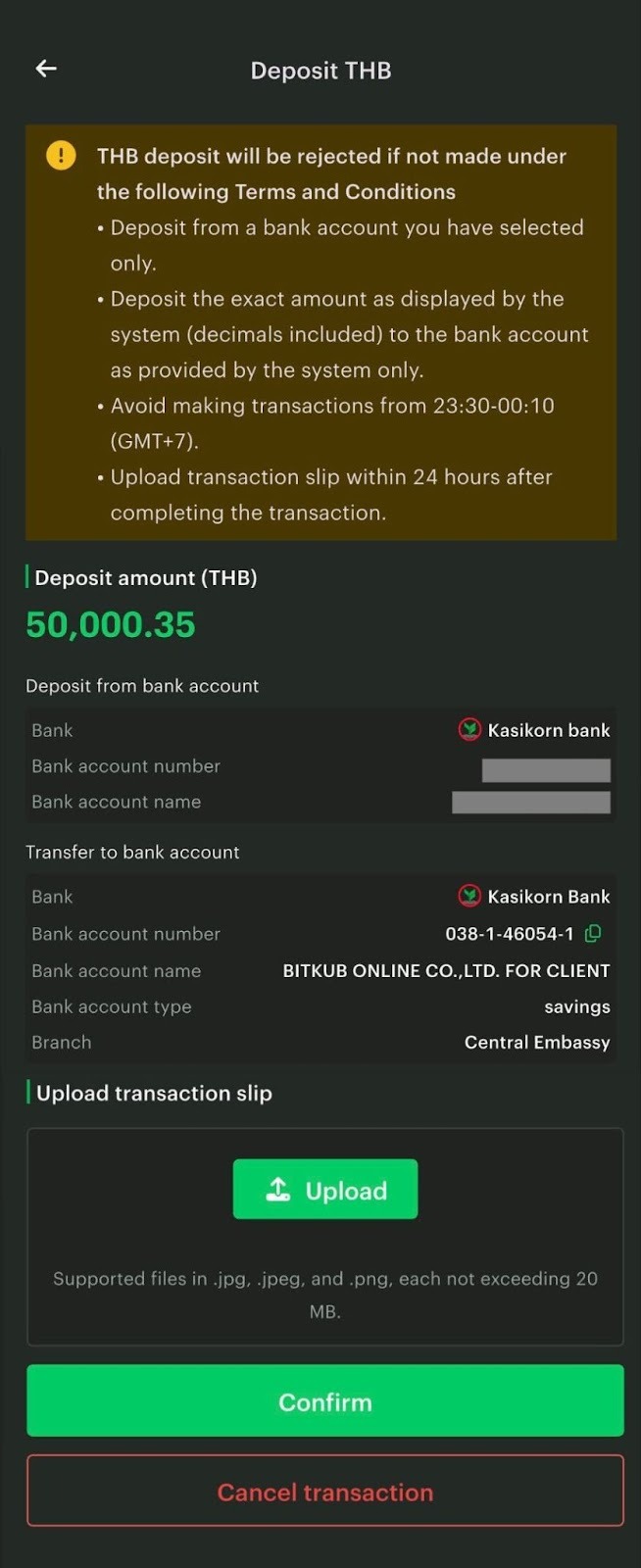 Bank transfer deposits will be processed within 30 minutes - 3 days after you upload the proof of deposit. This method is available for deposits of 50,000 THB or more.