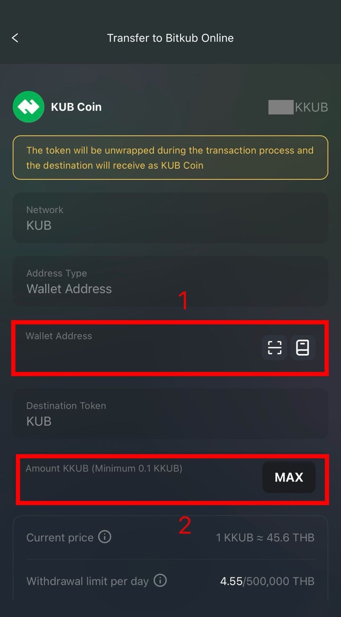 5. Fill in your wallet address on Bitkub Online and the amount of tokens that you wish to transfer. You can learn how to check the wallet address on the Bitkub application from the following links.