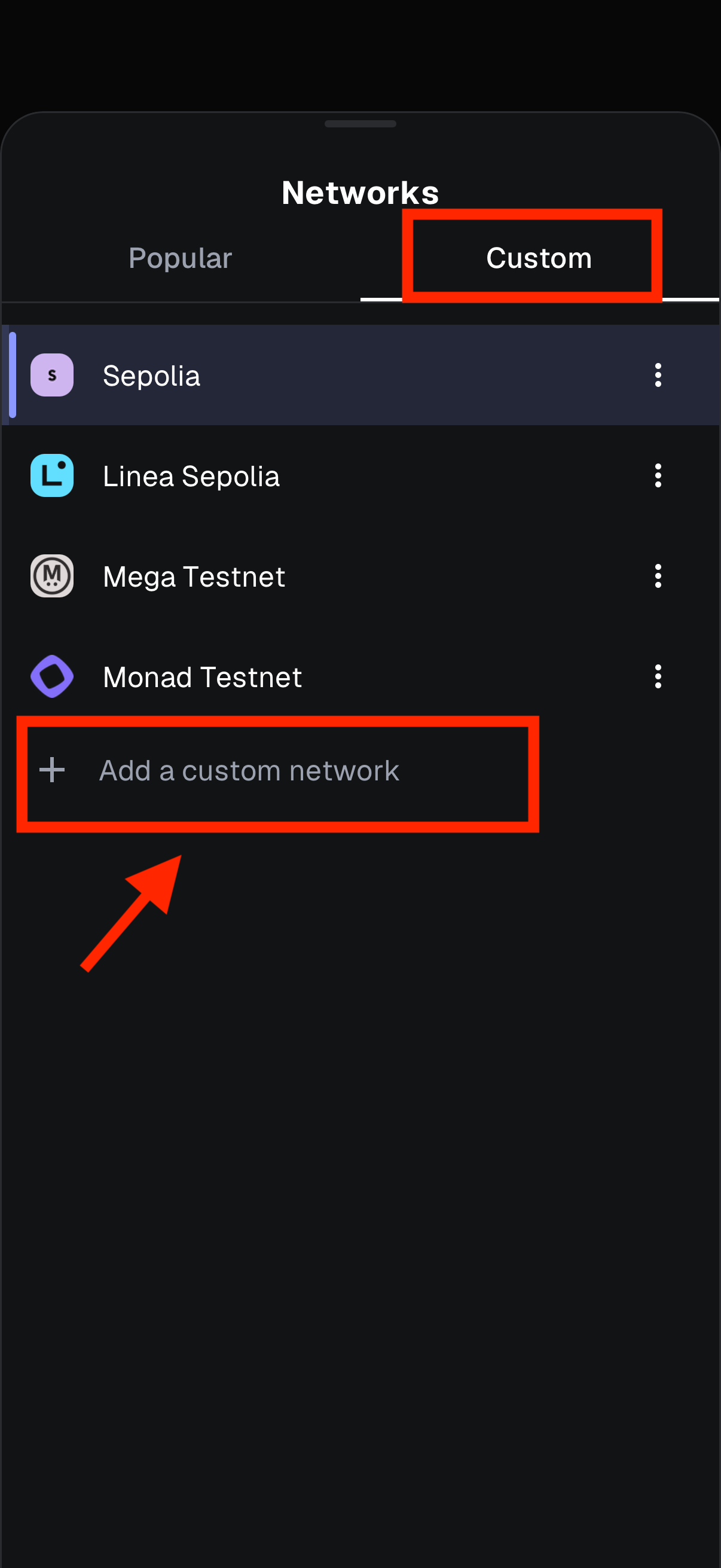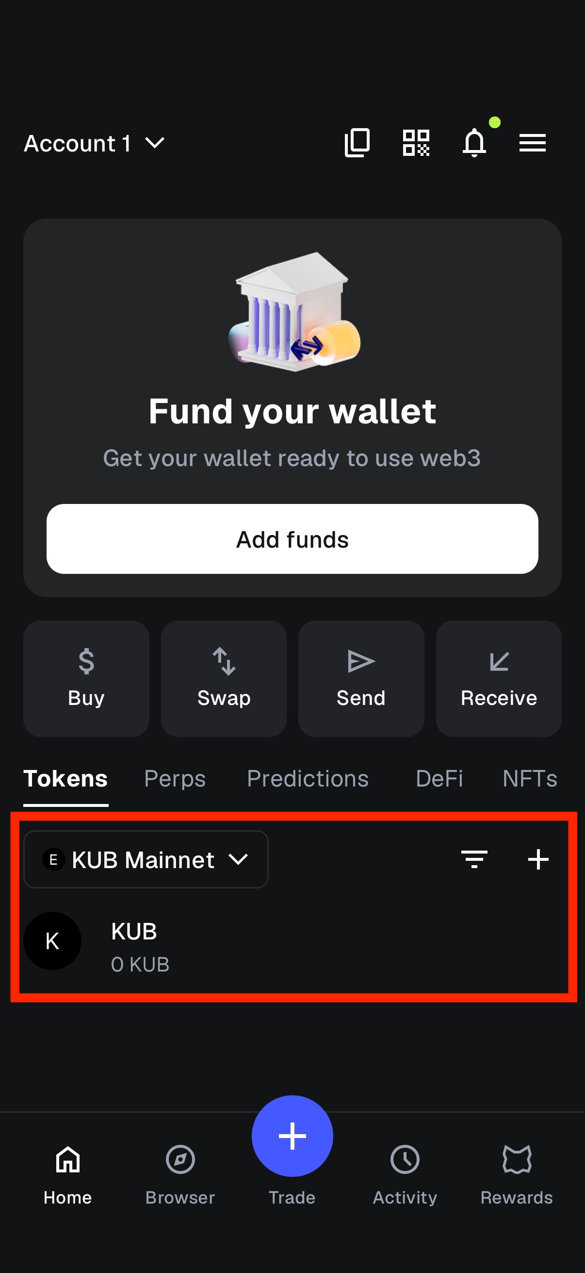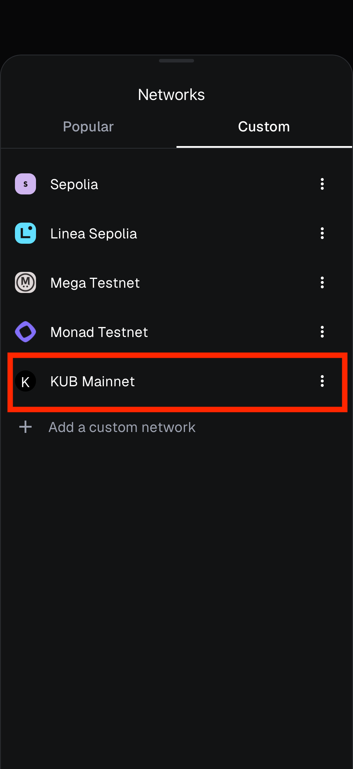 4. Before making any KUB transactions from other wallets, go to the "Custom" tab and select "KUB Mainnet."