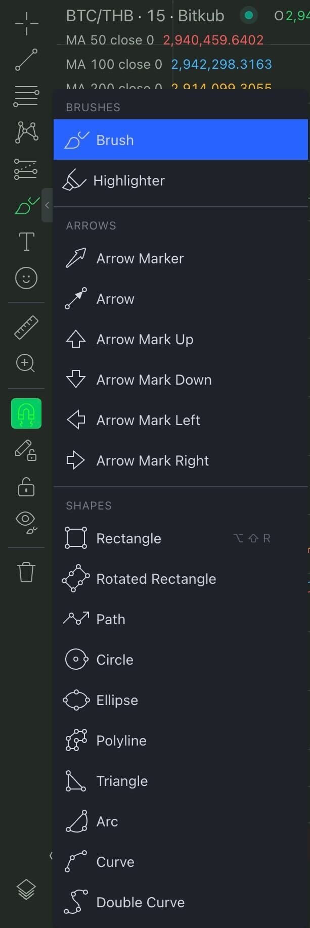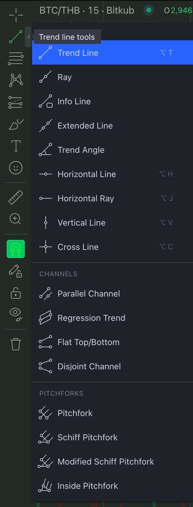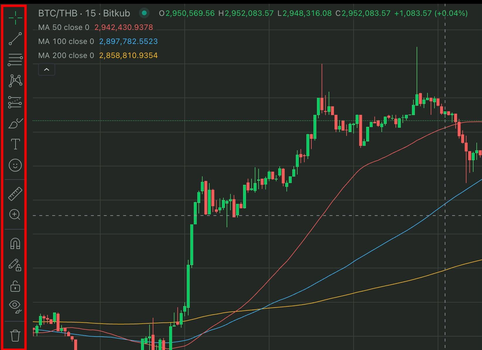 When you are on Bitkub’s market page, you will see the set of tools on the left side of the chart. These are the drawing tools you can draw on the chart to analyze the market’s trend as well as the price. There are a variety of tools to choose from, as follows.