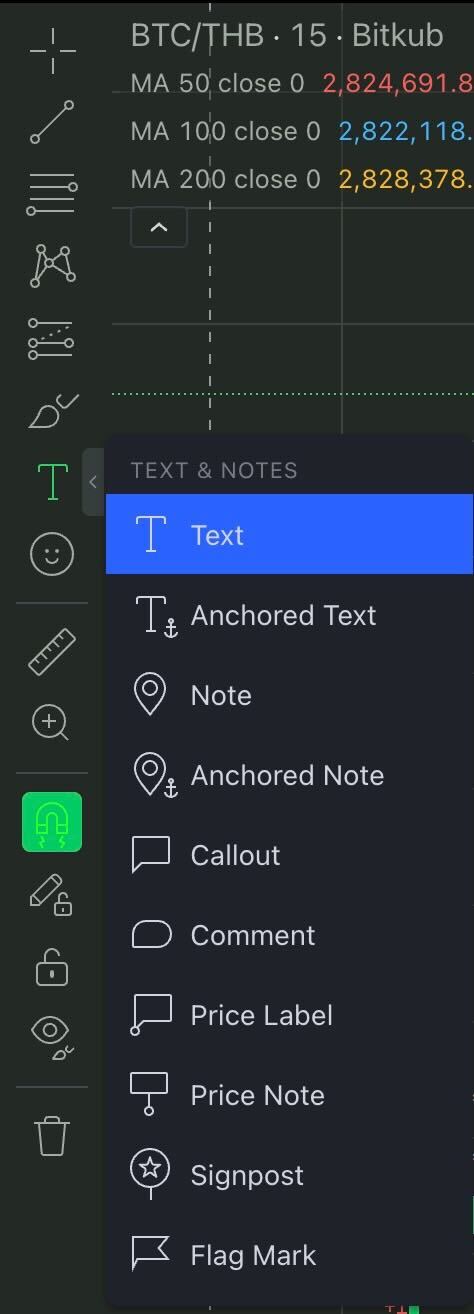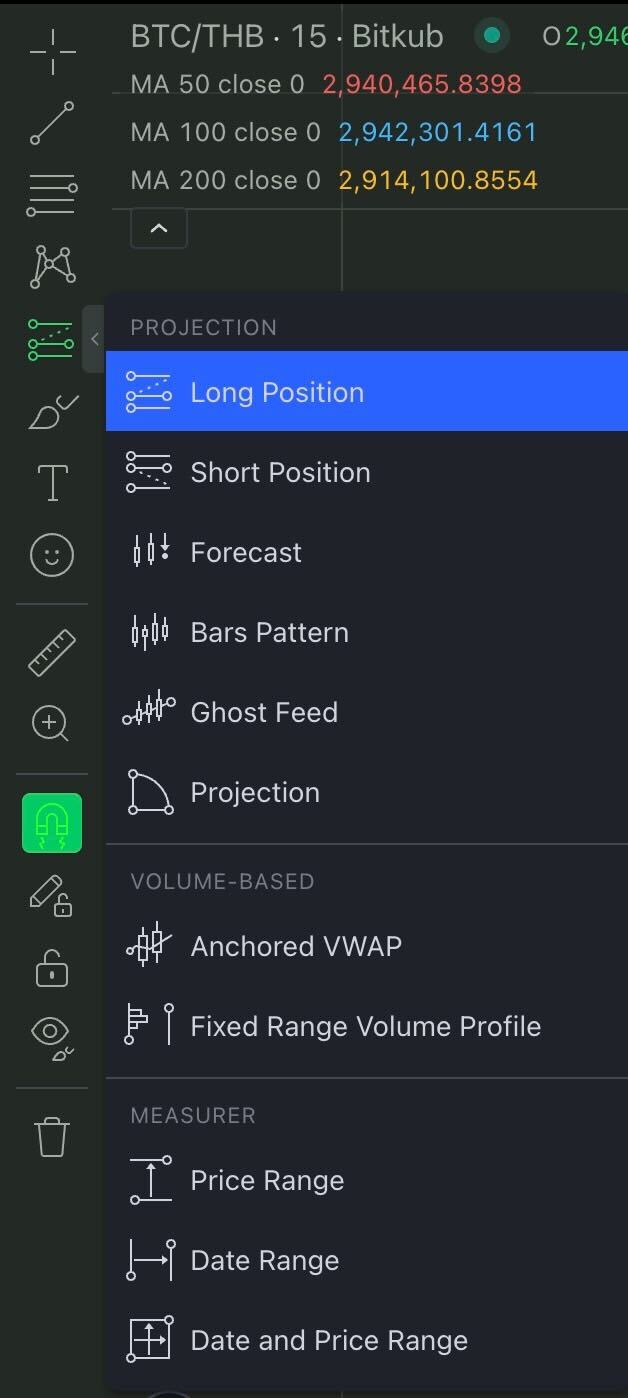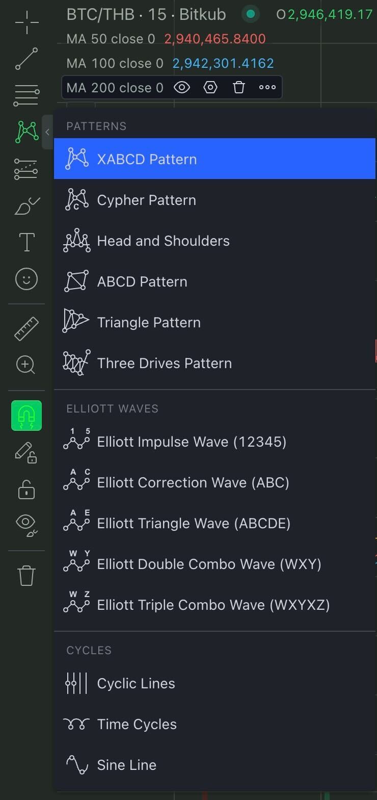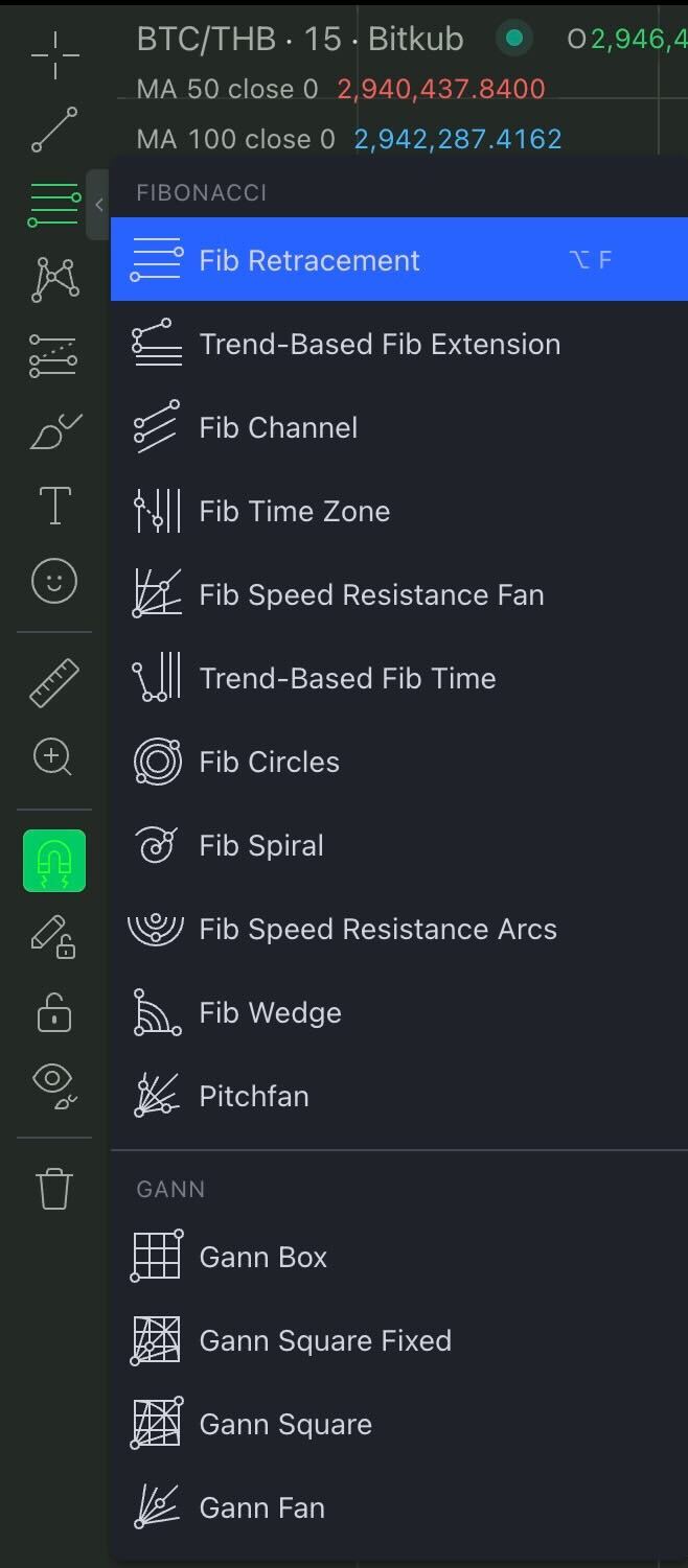 When you are on Bitkub’s market page, you will see the set of tools on the left side of the chart. These are the drawing tools you can draw on the chart to analyze the market’s trend as well as the price. There are a variety of tools to choose from, as follows.