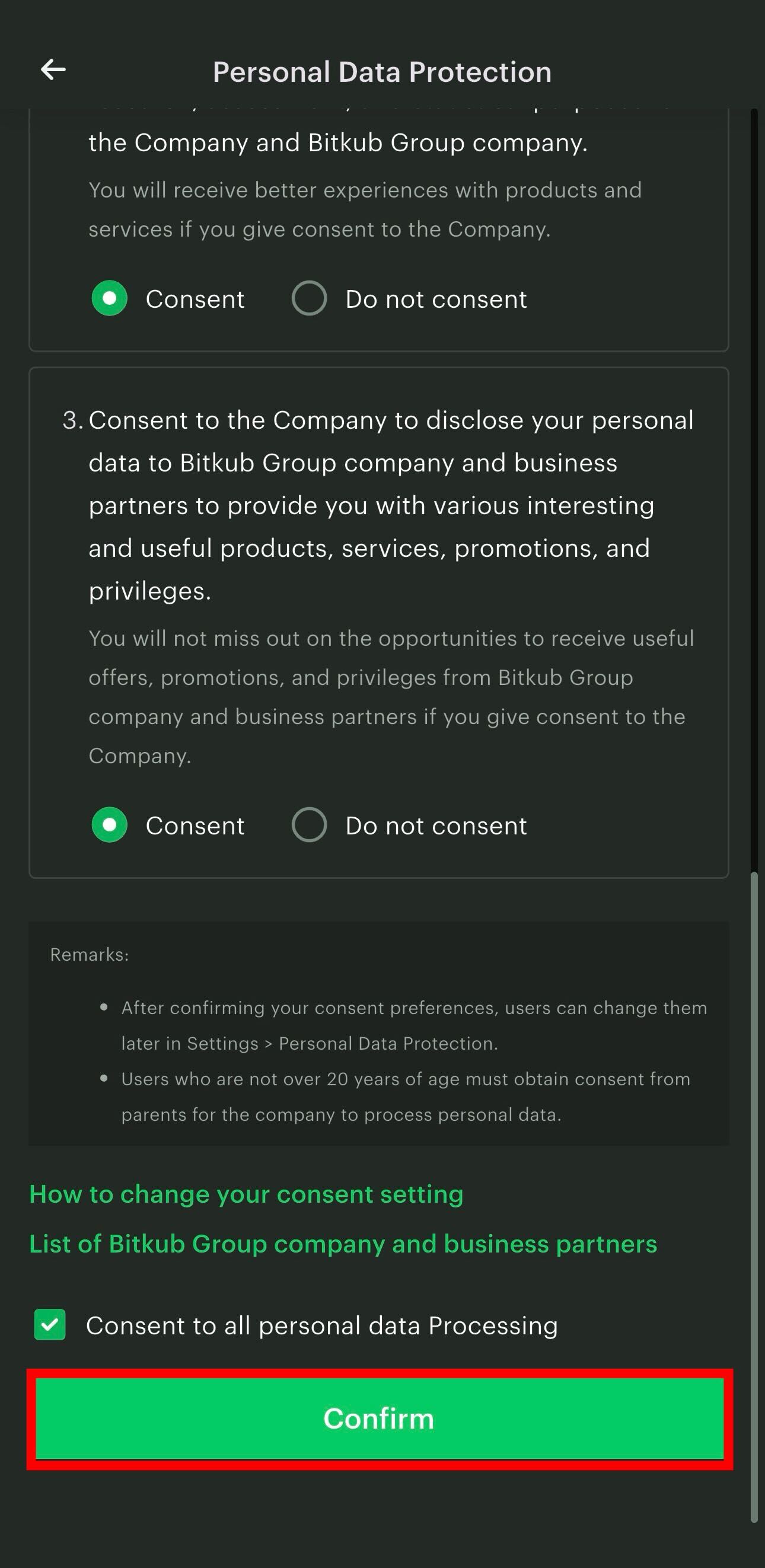 7.1 Check the box of each objective you agree to give consent to or check the box “Consent to all personal data processing” to give consent to all objectives, and tap “Confirm” when you finish.