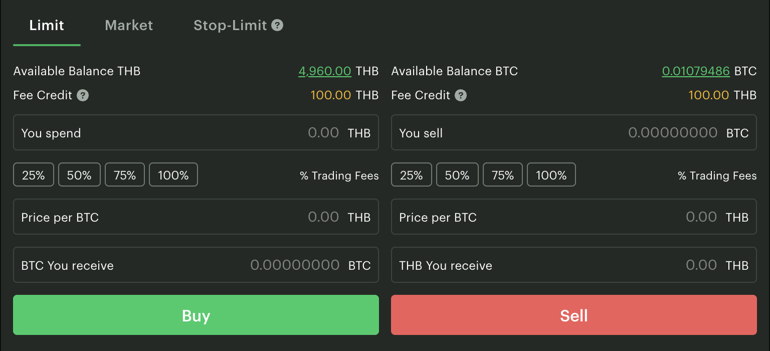 Limit Order is an option for a buy/sell trade that enables users to set the price per coin by themselves. Users can enter the amount of coin/fiat to spend from the account balance or the amount of coin/fiat they wish to acquire in the toolbox as shown in the picture.