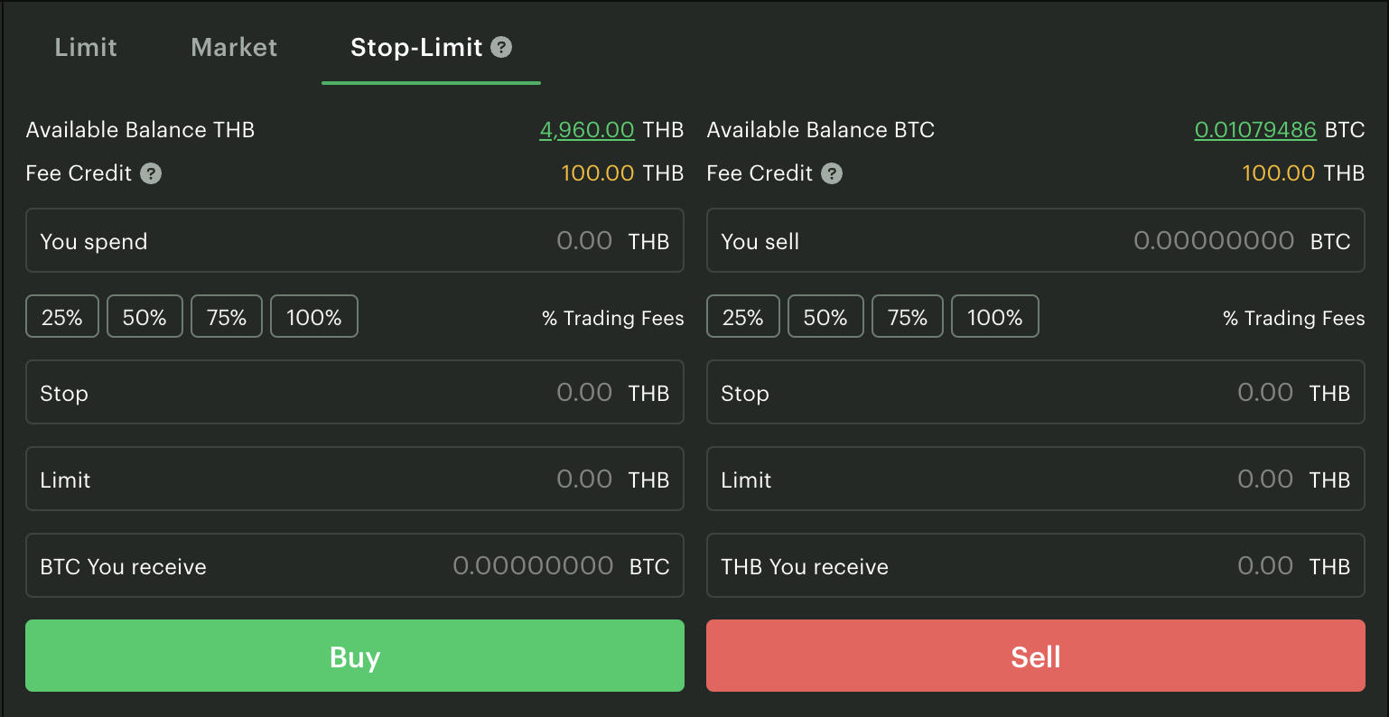You have 1 ETH in your wallet and the current price of Ethereum (ETH) is 100,000 THB. You anticipate that if the ETH price falls to 80,000 THB, this will signal a strong ETH downtrend. To prevent any loss from your held ETH, you create a stop-limit sell by setting the stop price at 80,000 THB and the limit price at 75,000 THB. When the price drops to 80,000 Baht, the system will immediately create a limit sell order of ETH at 75,000 THB. This allows you to sell your ETH between 75,000 - 80,000 THB price length.