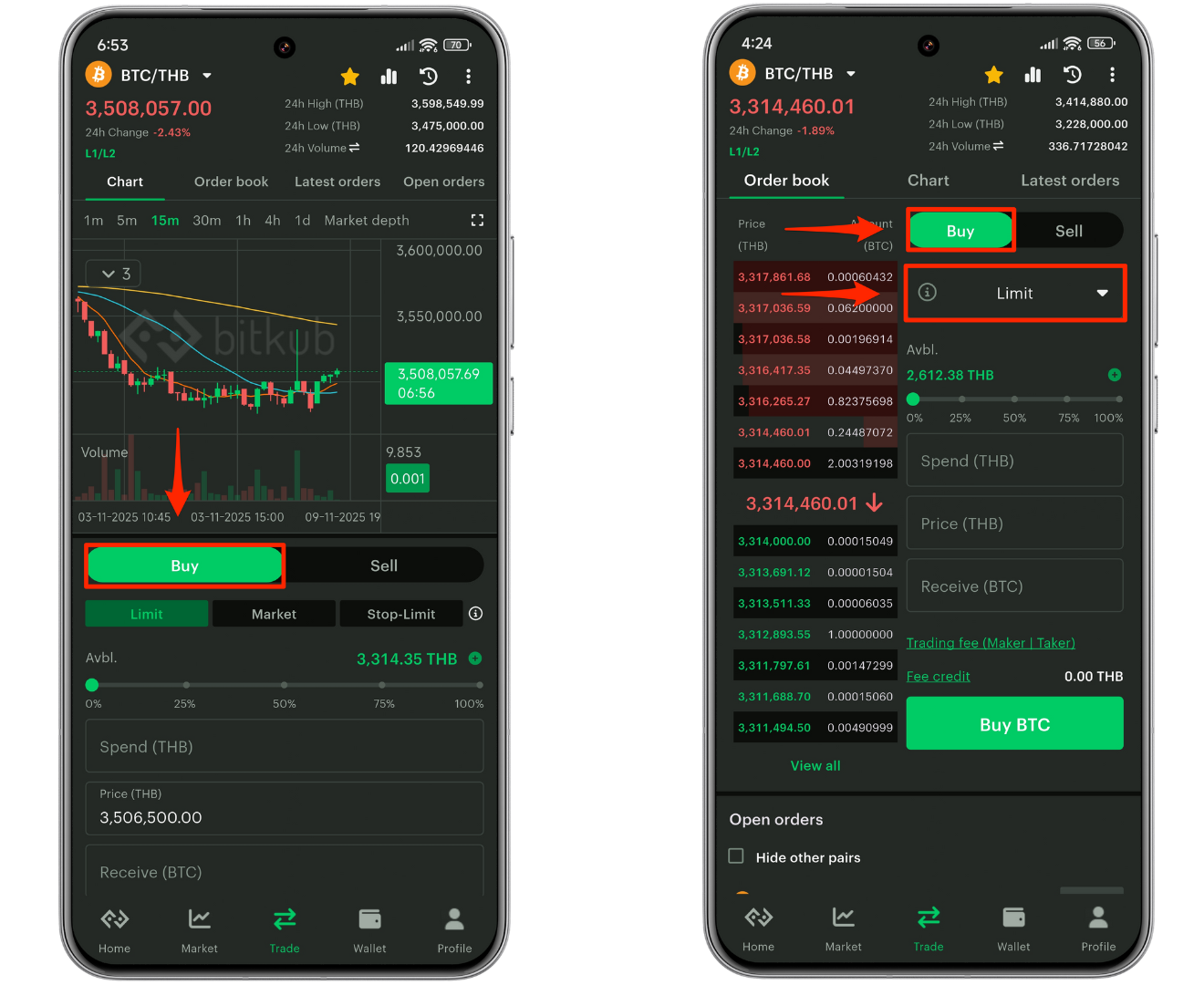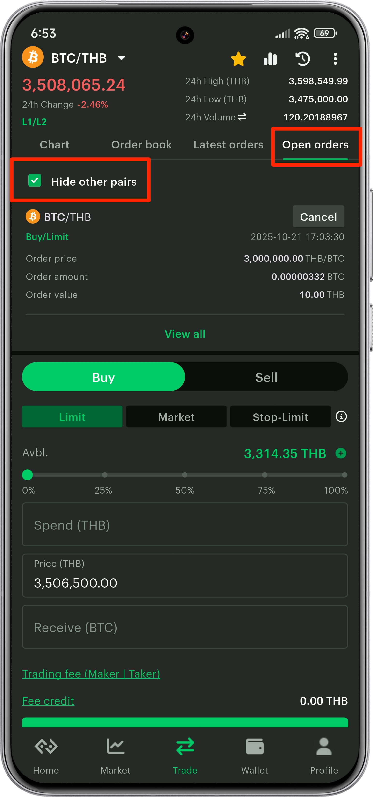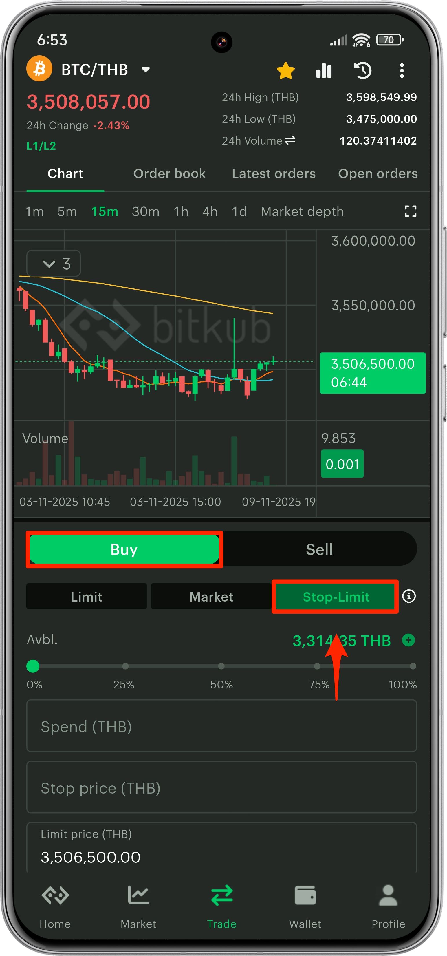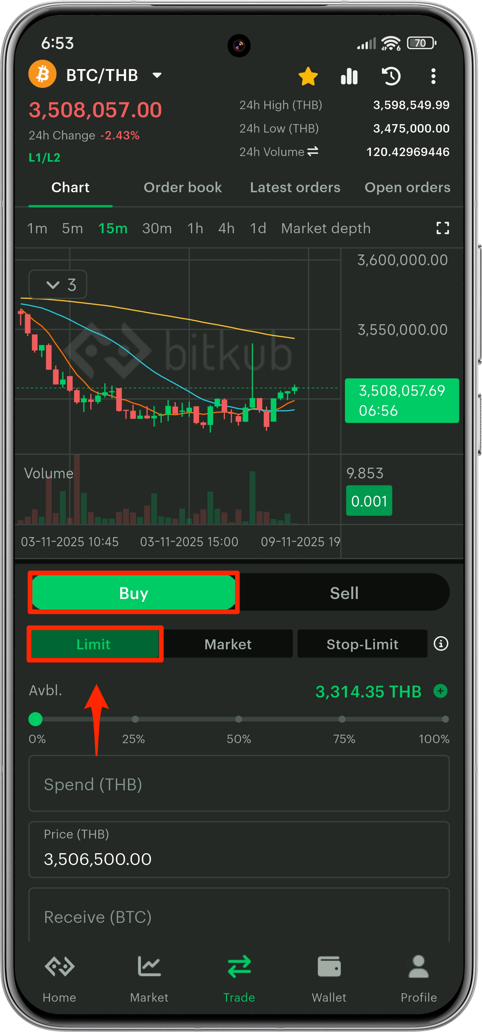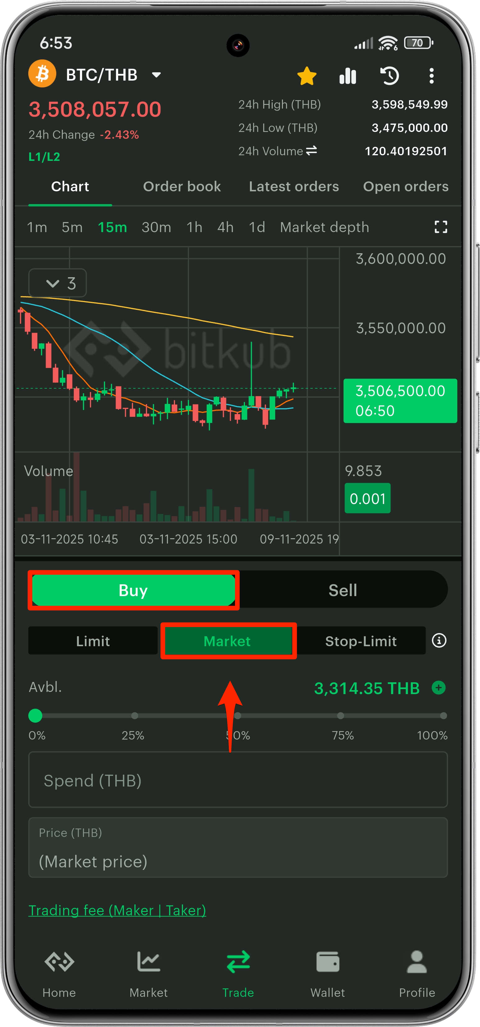 You can use the percent (%) toggle to adjust the buy amount based on your available balance (Selecting 100% will use your entire THB balance).