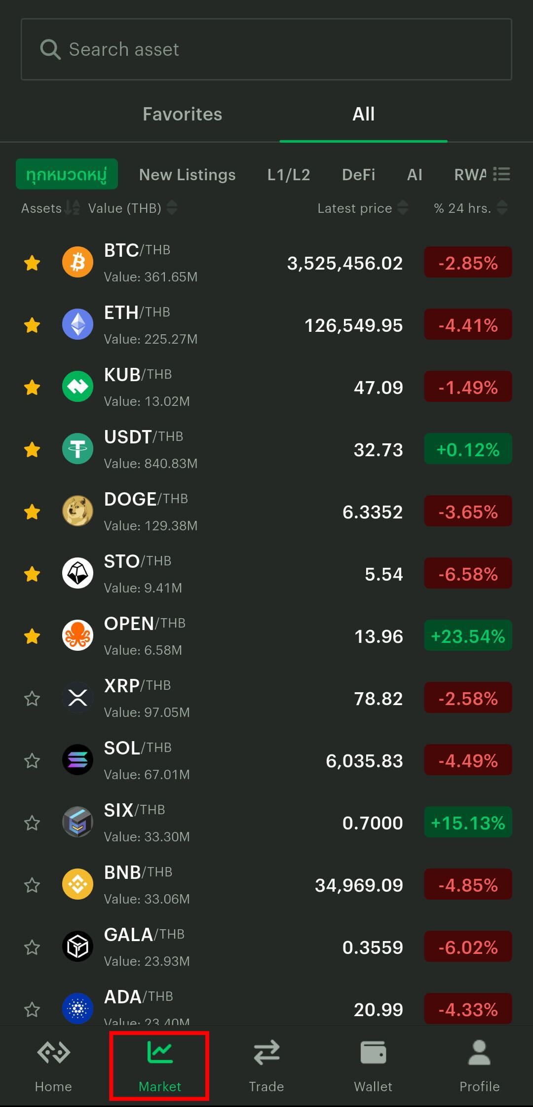2. Tap on "Market" at the bottom of the screen and choose the cryptocurrency you wish to cancel orders.