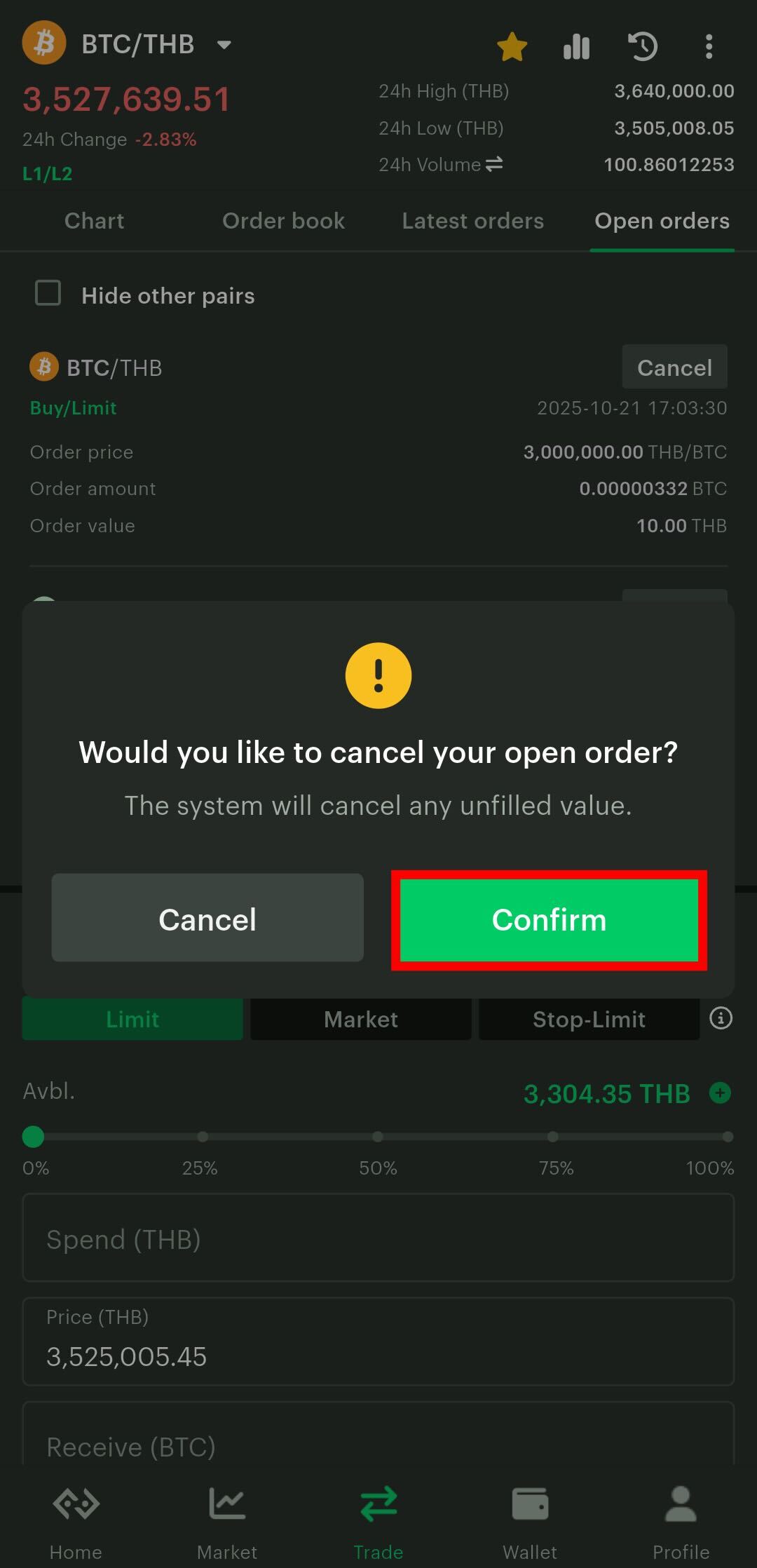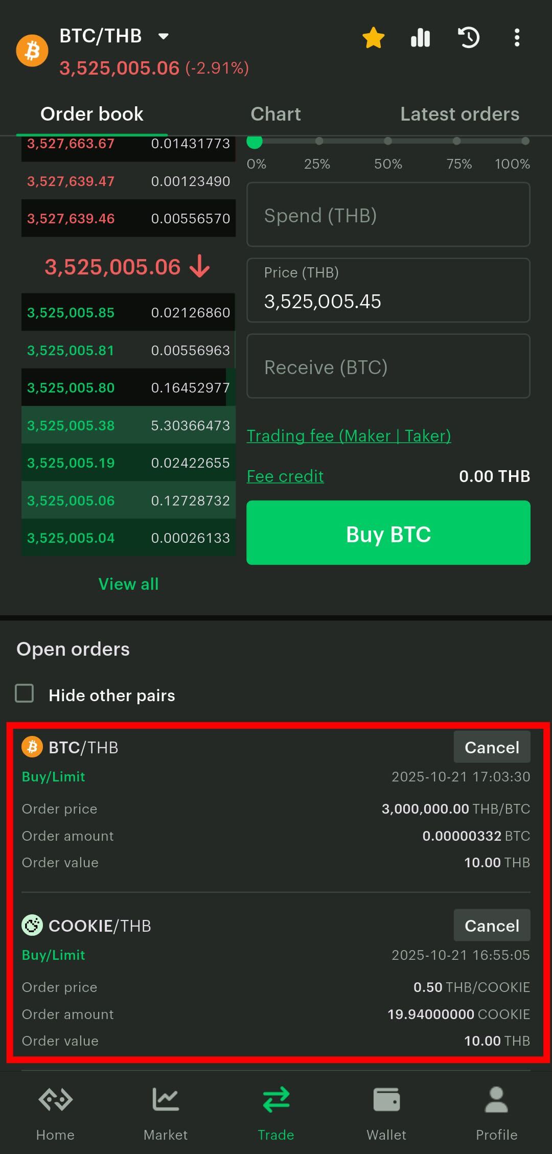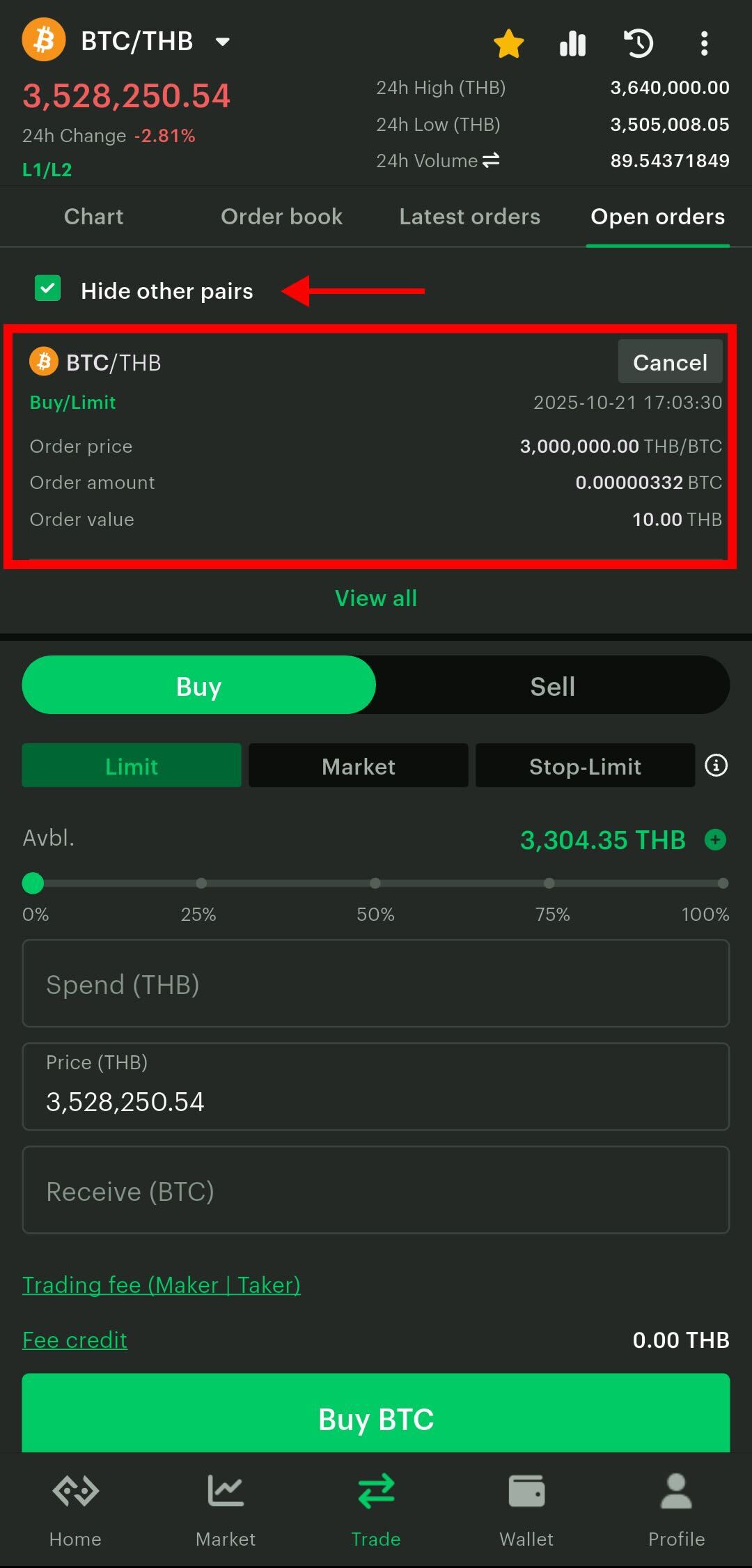 If you want to cancel your open orders from the Bitkub website, please visit How to cancel open order.