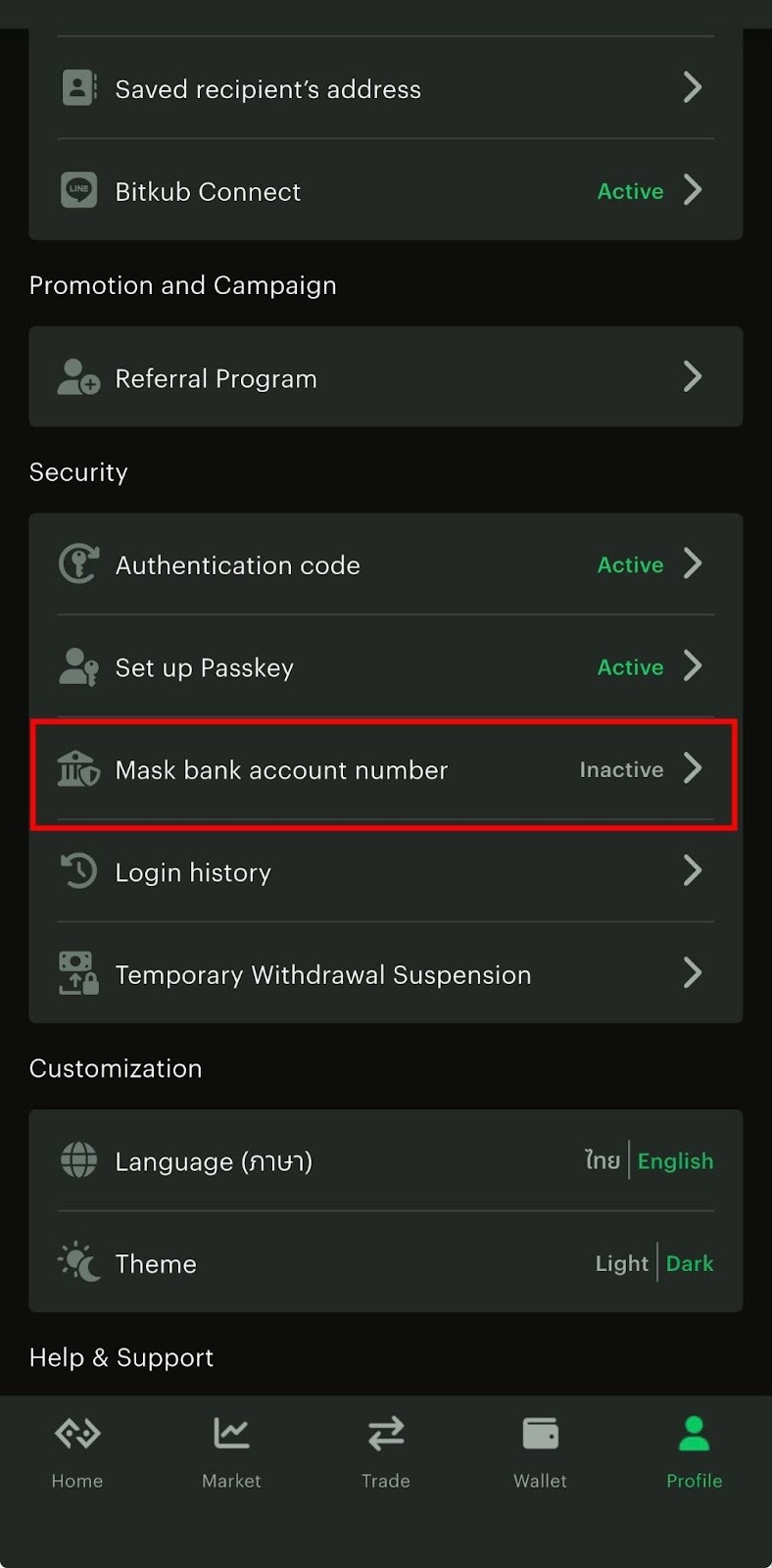 - After activating the bank account data masking feature, your bank account number will appear as follows: xxx-x-xx789-0 on the bank account adding, THB deposit page, and THB withdrawal pages.