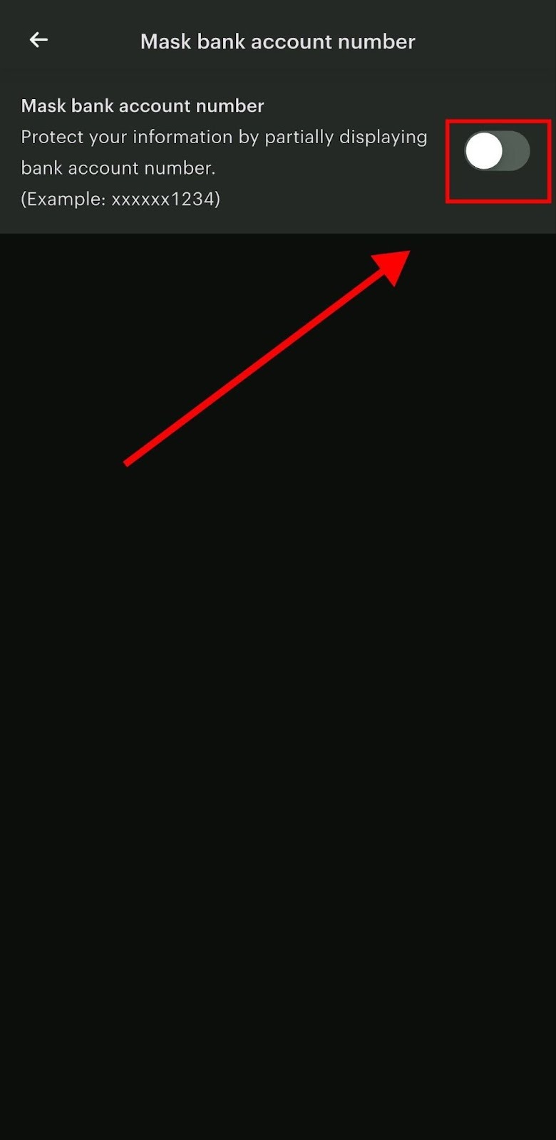 - If you want your bank account number to be fully displayed, please follow the steps above and change the "Mask Bank Account Numbers" toggle to grey.