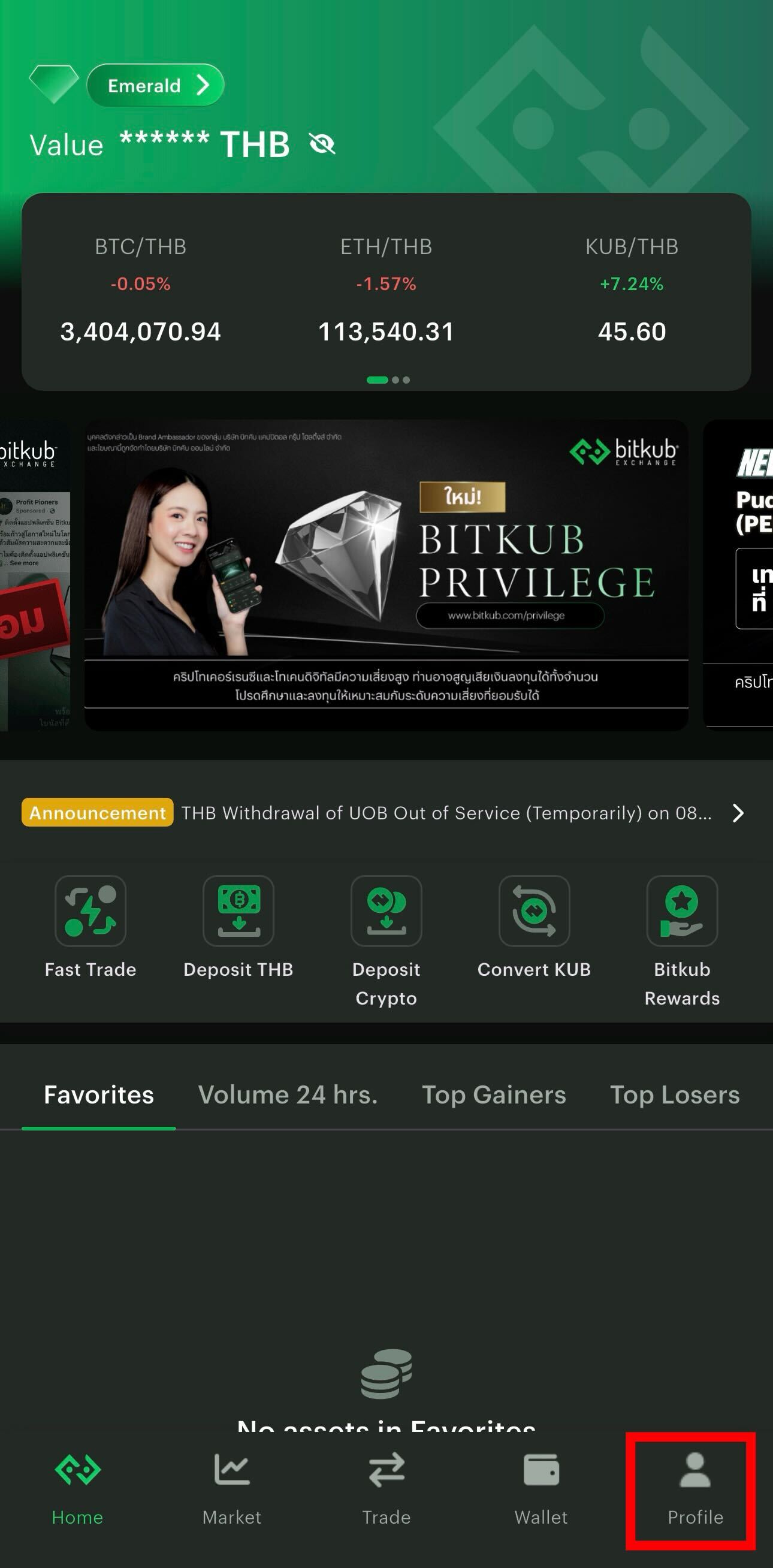 - If you are on the Bitkub website, select the profile icon in the top-right corner. On the other hand, if you log in through the Bitkub application, tap on the ‘Setting’ menu.