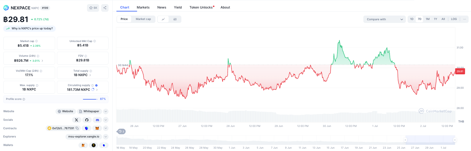 At the time of writing, NXPC is trading at approximately $0.9191 USD (about 29.81 THB per 1 NXPC). Notably, NXPC reached its all-time high of $3.84 USD (approximately 124.56 THB per 1 NXPC) on 15 May 2025.