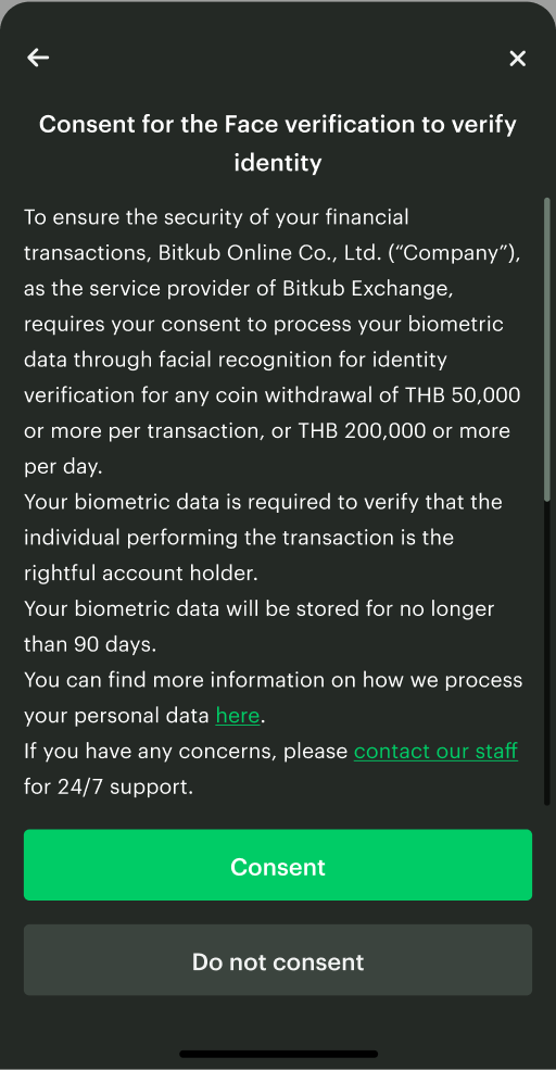 To enhance security and minimize risks in digital asset transactions from unauthorized account access, Bitkub Exchange now uses face verification as part of our security system for coin withdrawals.