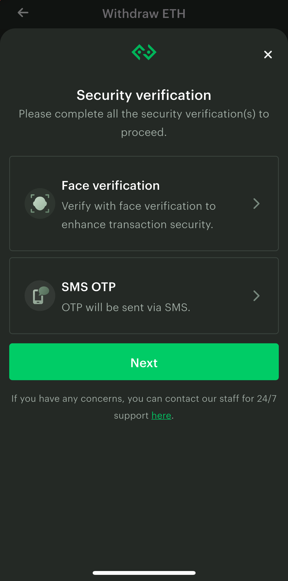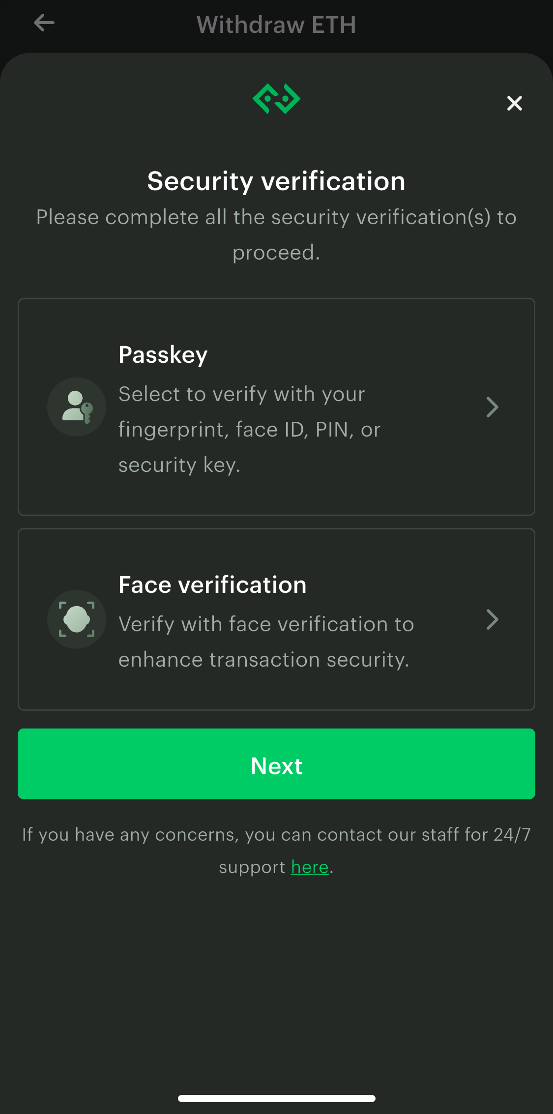When a withdrawal transaction meets the conditions mentioned above, a security verification window, including face verification, will appear. You must complete the steps according to your enabled security settings as follows: