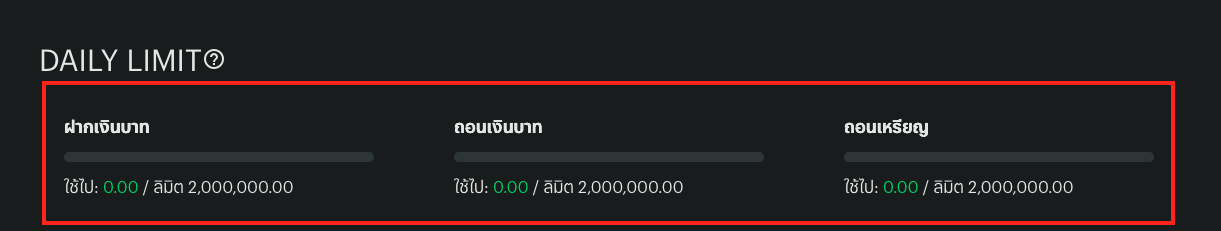 ท่านจะเห็นลิมิตปัจจุบัน และยอดที่ใช้ไปแล้วประจำวัน ของการฝากเงินบาท ถอนเงินบาท และถอนเหรียญ ตามลำดับ