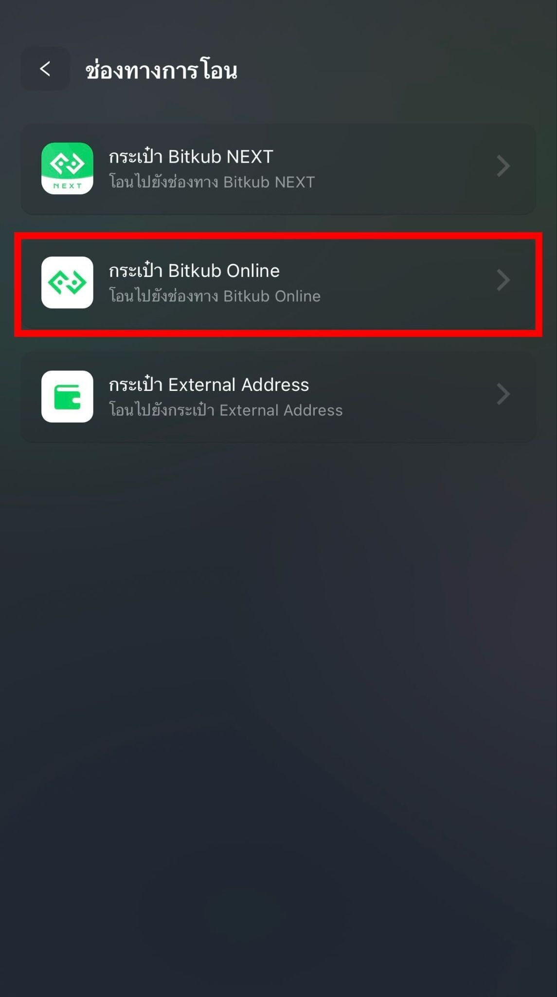 4. เลือก “กระเป๋า Bitkub Online” เพื่อโอนเหรียญไปยังปลายทาง