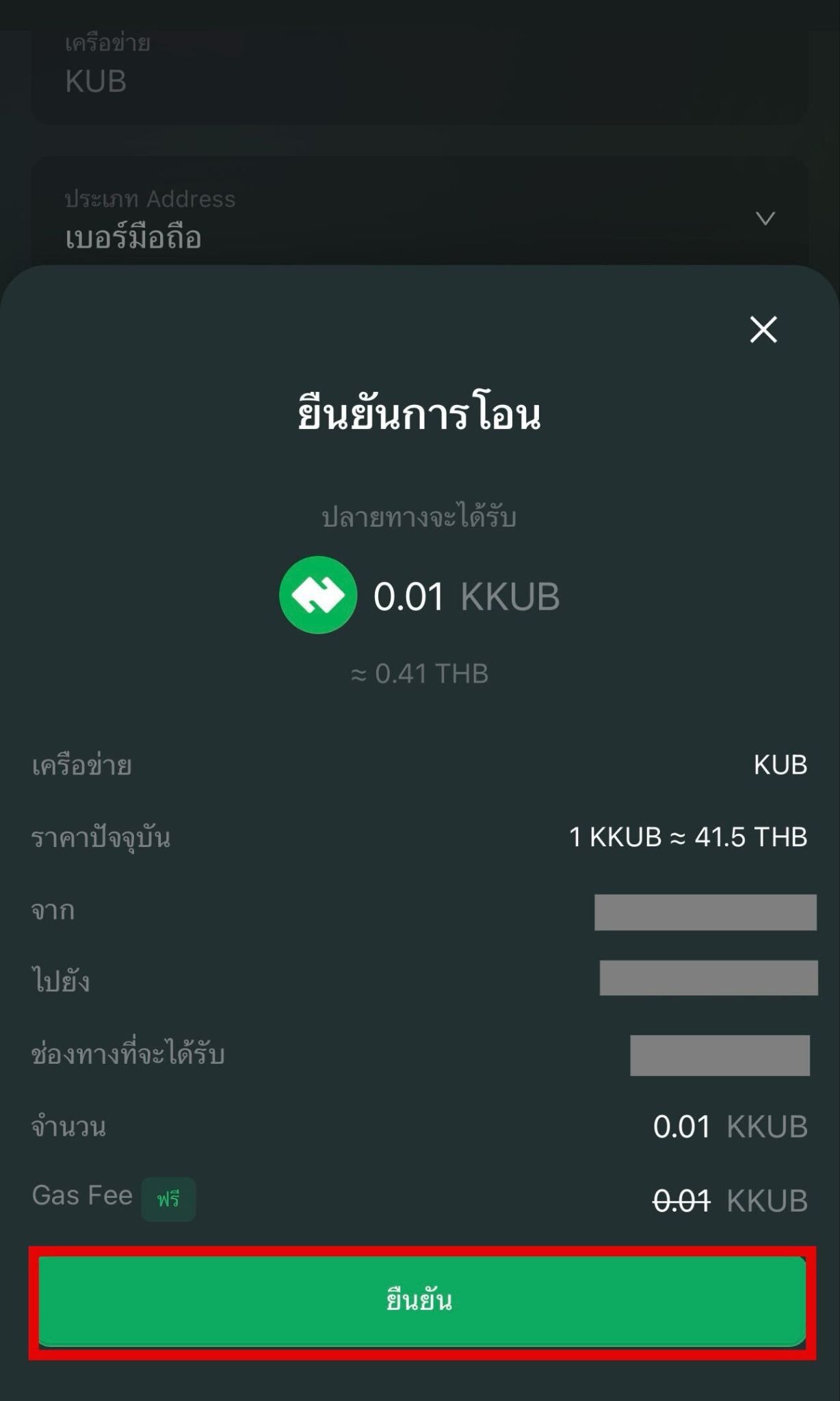 7. ตรวจสอบรายละเอียดการโอนของท่านอีกครั้ง จากนั้นเลือก “ยืนยัน” เพื่อยืนยันการโอนเหรียญไปยัง Bitkub Online