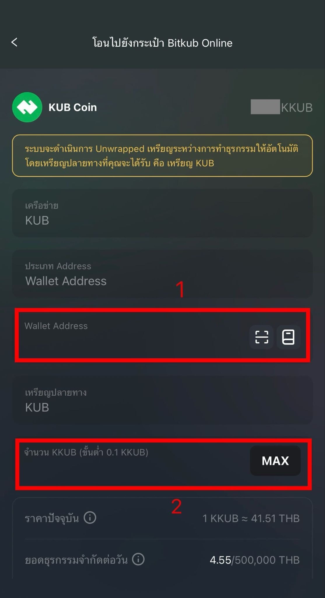 ท่านสามารถโอนเหรียญจาก KUB Wallet ไปยัง Bitkub Online ได้ตามขั้นตอนดังนี้