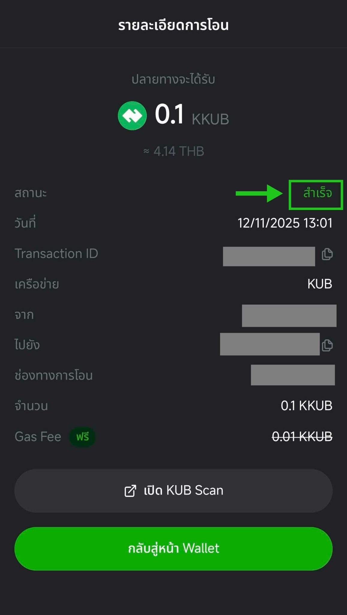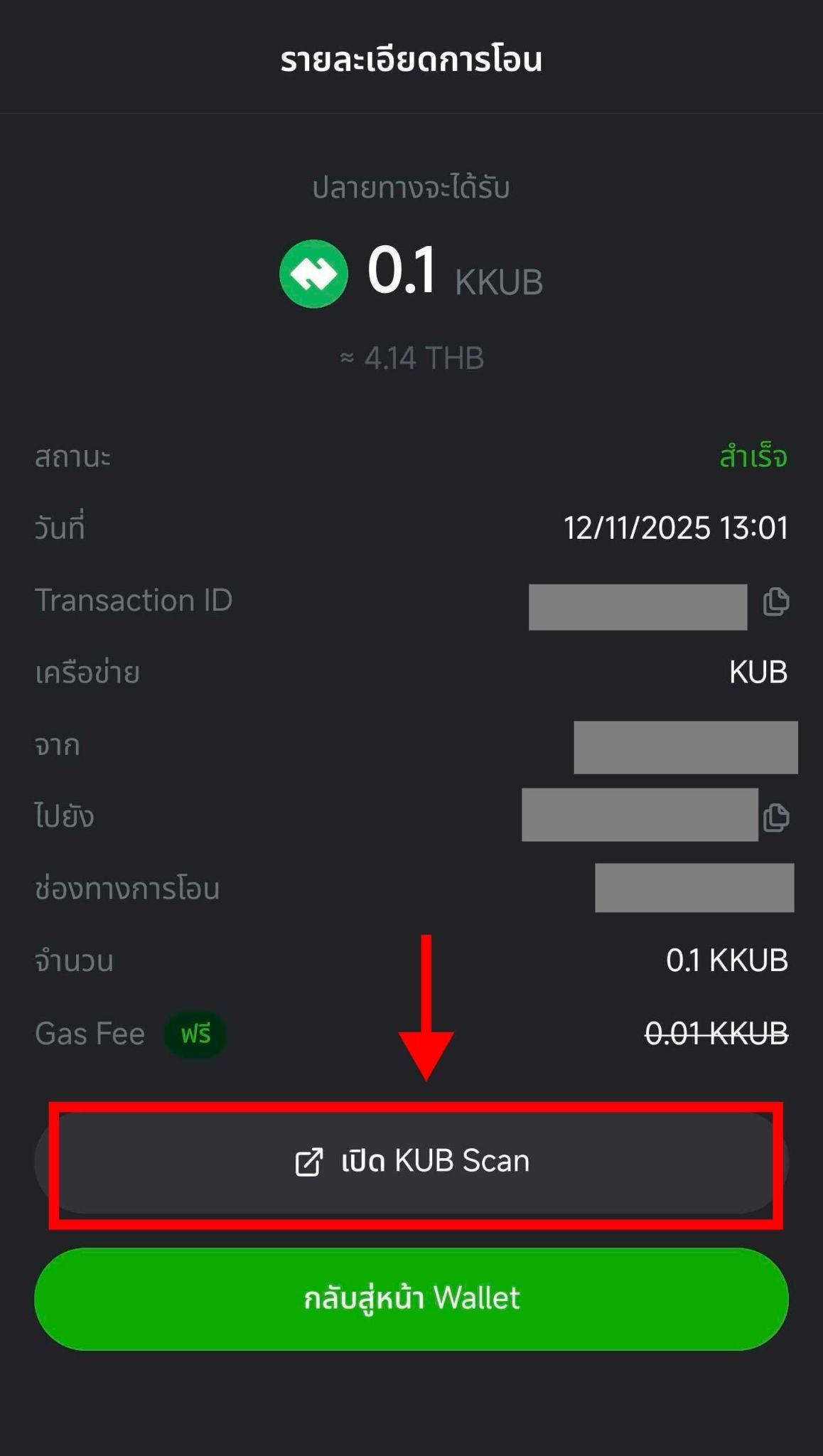10. ท่านสามารถเลือก “เปิด KUB Scan” เพื่อตรวจสอบรายการธุรกรรมบนบล็อกเชนได้
