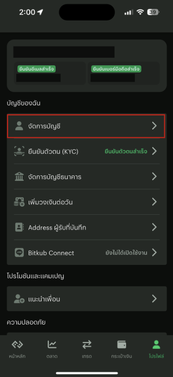 2. ไปที่หน้า “โปรไฟล์” จากแถบเครื่องมือด้านล่าง และเลือกหัวข้อ “จัดการบัญชี”
