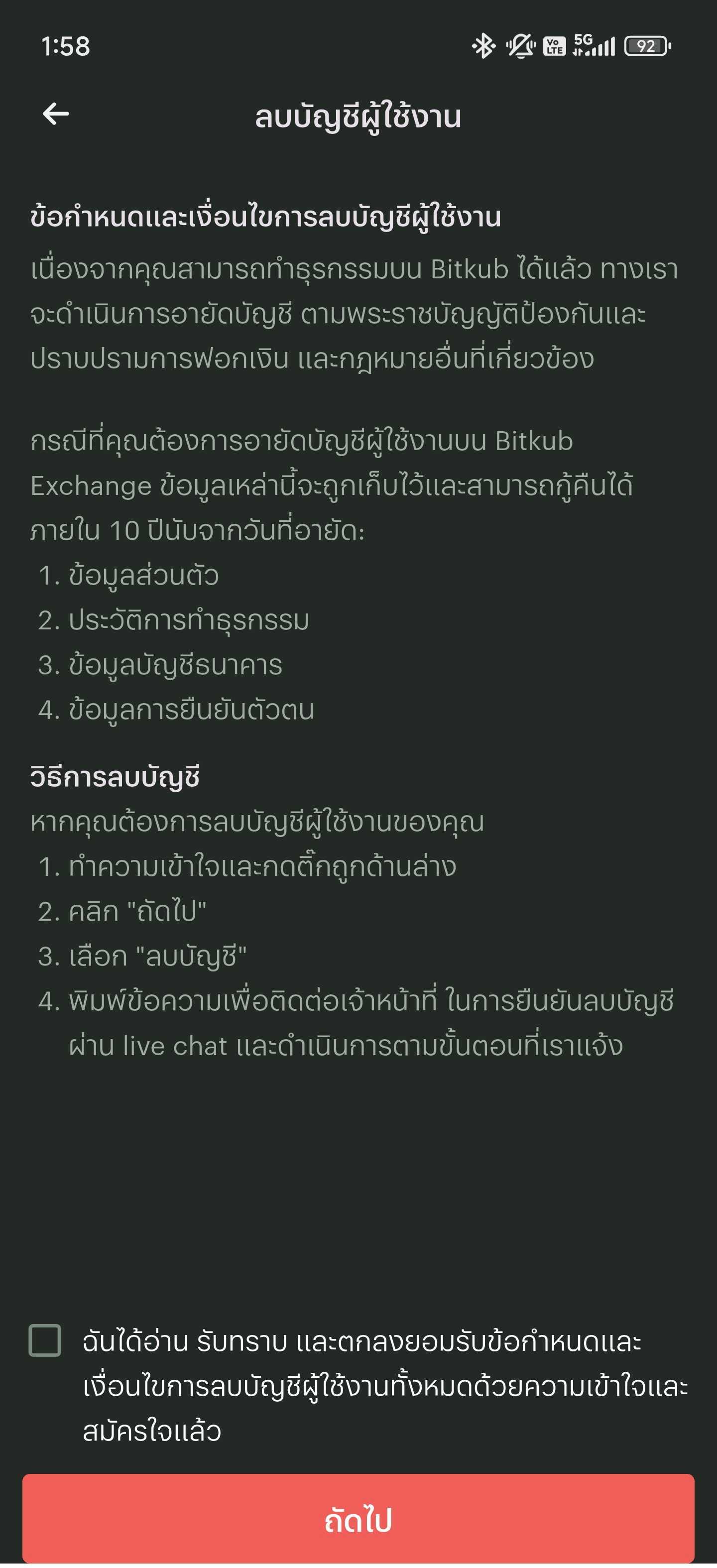 - เมื่อบัญชีของท่านถูกลบออกจากระบบแล้ว จะไม่สามารถทำการกู้คืนหรือเปลี่ยนแปลงใด ๆ ได้ ในกรณีที่ท่านต้องการกลับมาใช้งานกับบิทคับ เอ็กซ์เชนจ์หลังการลบบัญชีสำเร็จ ท่านต้องทำการเปิดบัญชีใหม่เท่านั้น