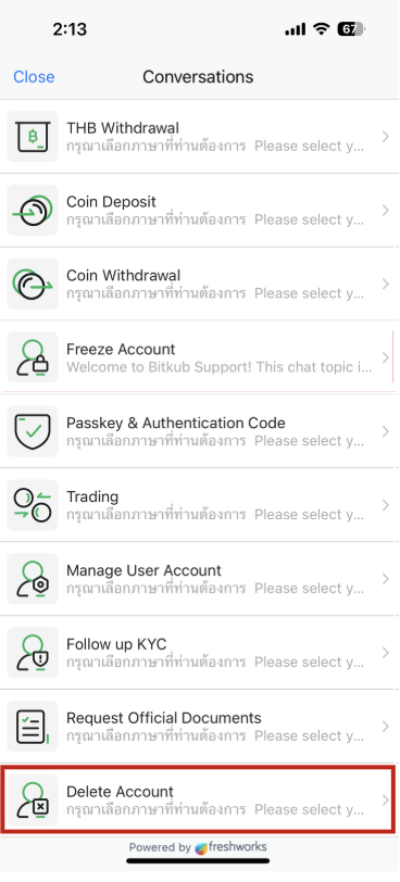 5. ระบบจะพาไปยังหน้าติดต่อ Customer Support ให้เลือกหัวข้อการติดต่อเป็น “ลบบัญชี” พร้อมระบุข้อความสำหรับเจ้าหน้าที่