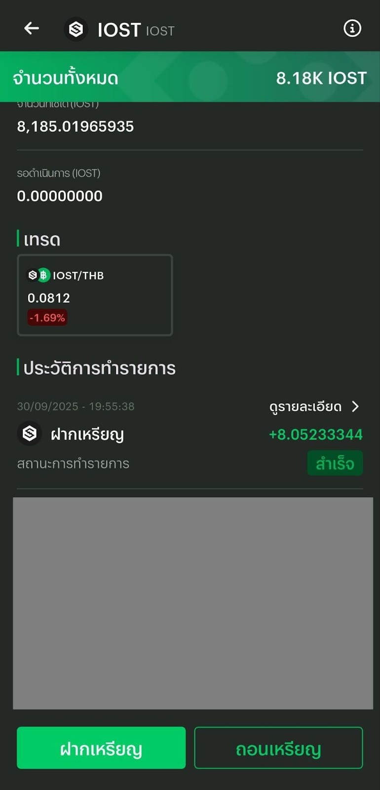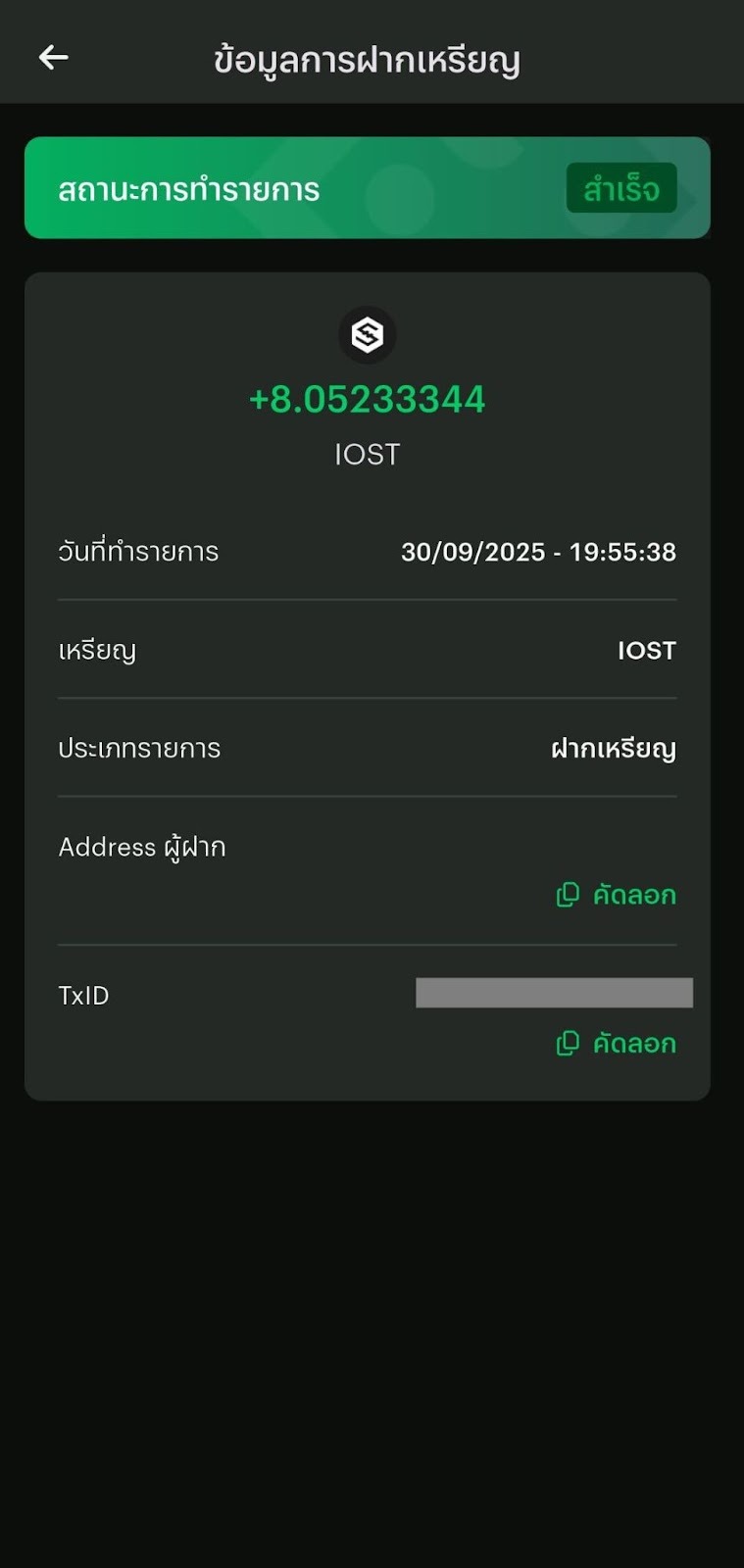 7. รายการฝากเหรียญที่กำลังดำเนินการ จะแสดงอยู่ข้างล่าง "ประวัติการทำรายการ" ซึ่งสามารถดูได้โดยกดเข้าไปที่เหรียญที่ท่านดำเนินการฝาก (รายการจะขึ้นก็ต่อเมื่อธุรกรรมเข้าสู่ระบบบล็อกเชนแล้วเท่านั้น)
