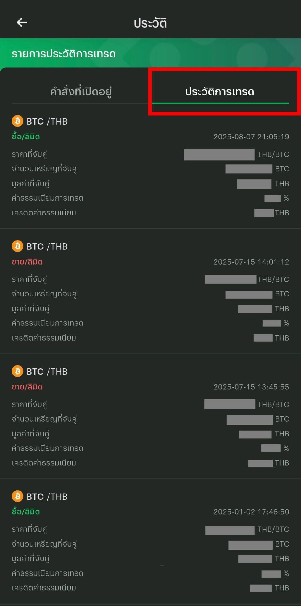 9. ท่านสามารถดูประวัติการทำรายการได้ที่เมนู “เทรด” บนแถบเมนูด้านล่าง