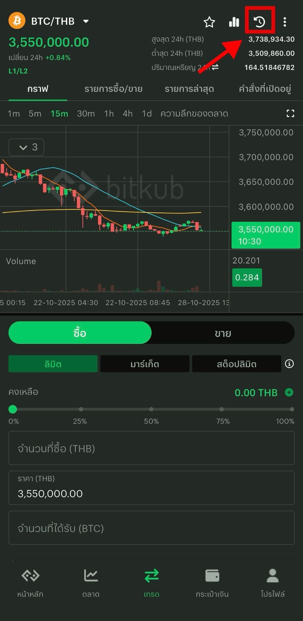 - กดที่ไอคอนนาฬิกาบริเวณมุมบนขวาของหน้าจอ และกดเลือก “ประวัติการเทรด”