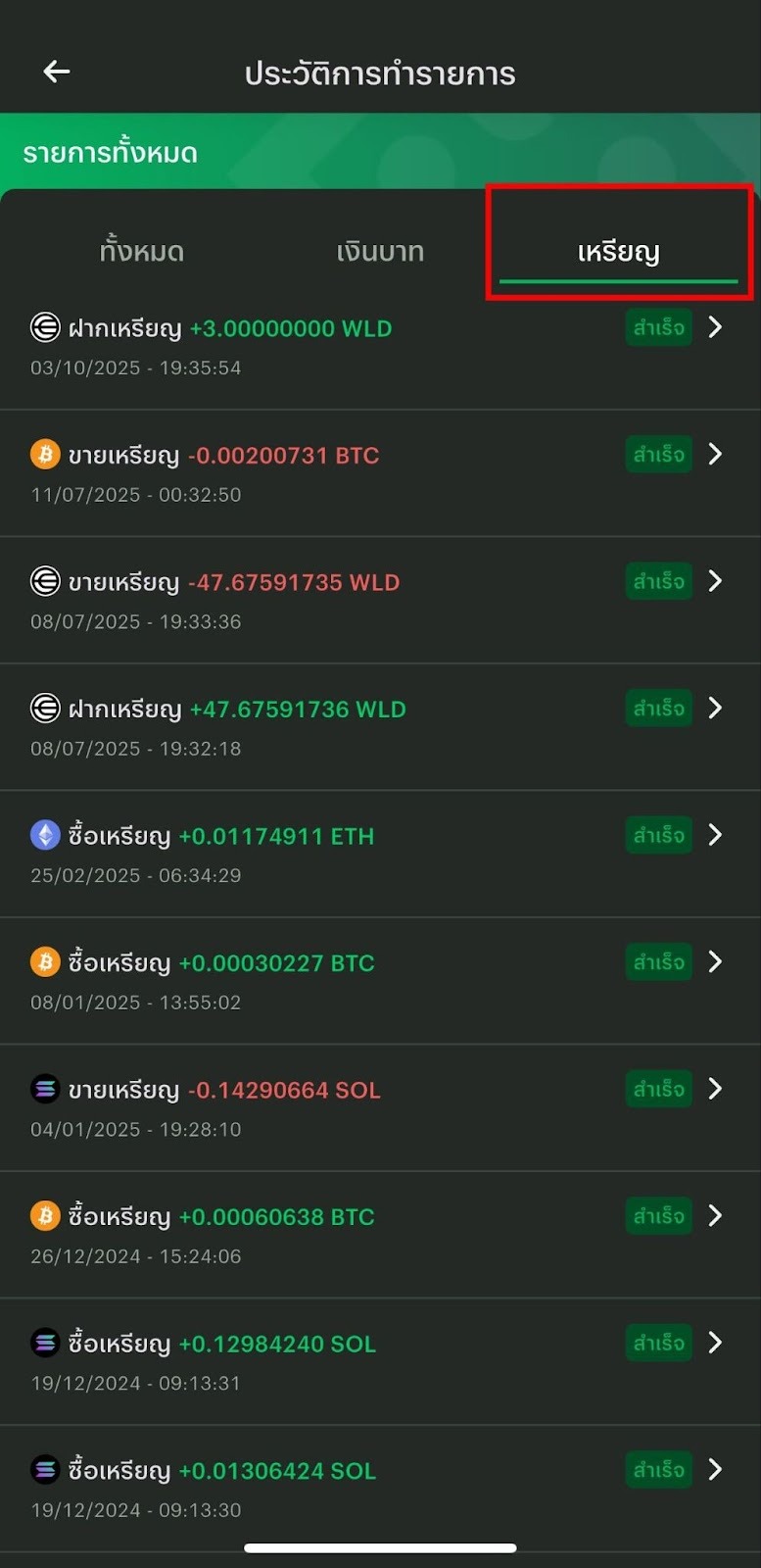 6. กดที่ "เหรียญ" เพื่อดูสถานะการทำธุรกรรมเหรียญ