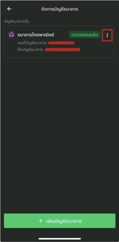 4. เลือกบัญชีธนาคารที่ท่านต้องการลบ โดยการกดจุดสามจุดที่บัญชีนั้น
