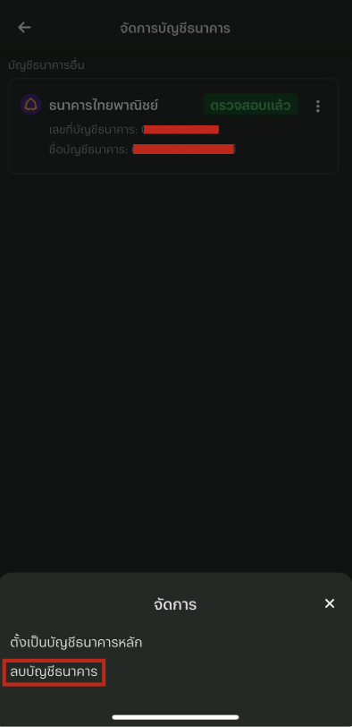 หมายเหตุ: หากบัญชีธนาคารที่ท่านต้องการลบเป็นบัญชีหลัก (Primary) ท่านต้องทำการเปลี่ยนบัญชีธนาคารอื่นให้เป็นบัญชีหลักก่อน จึงจะทำการลบบัญชีธนาคารที่ต้องการได้