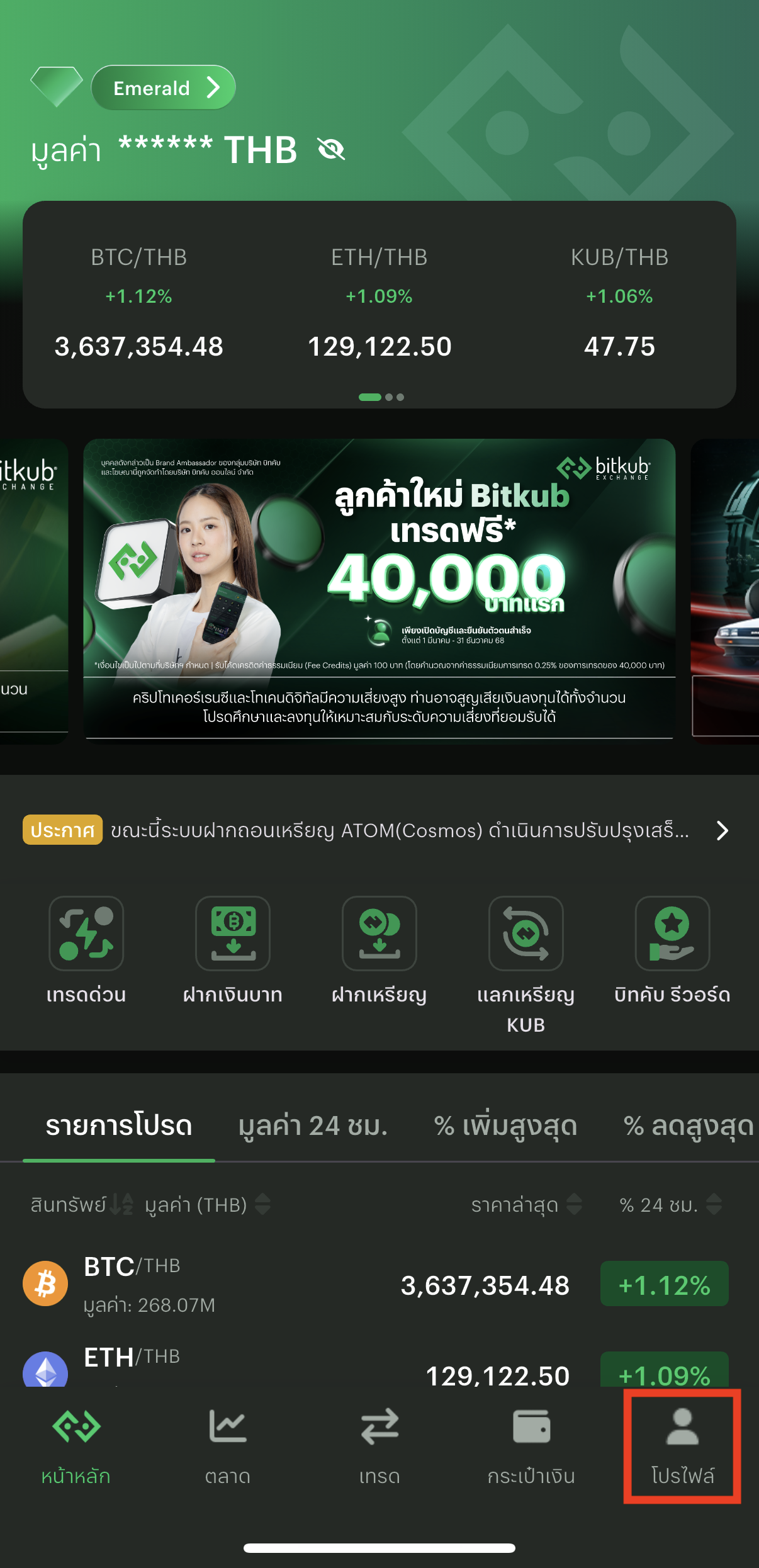 1. เปิดแอปพลิเคชันบิทคับ เอ็กซ์เชนจ์ และลงชื่อเข้าใช้บัญชีของท่าน