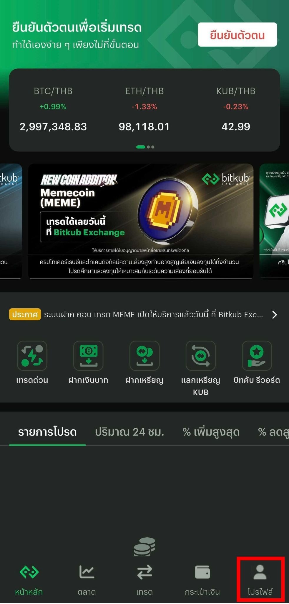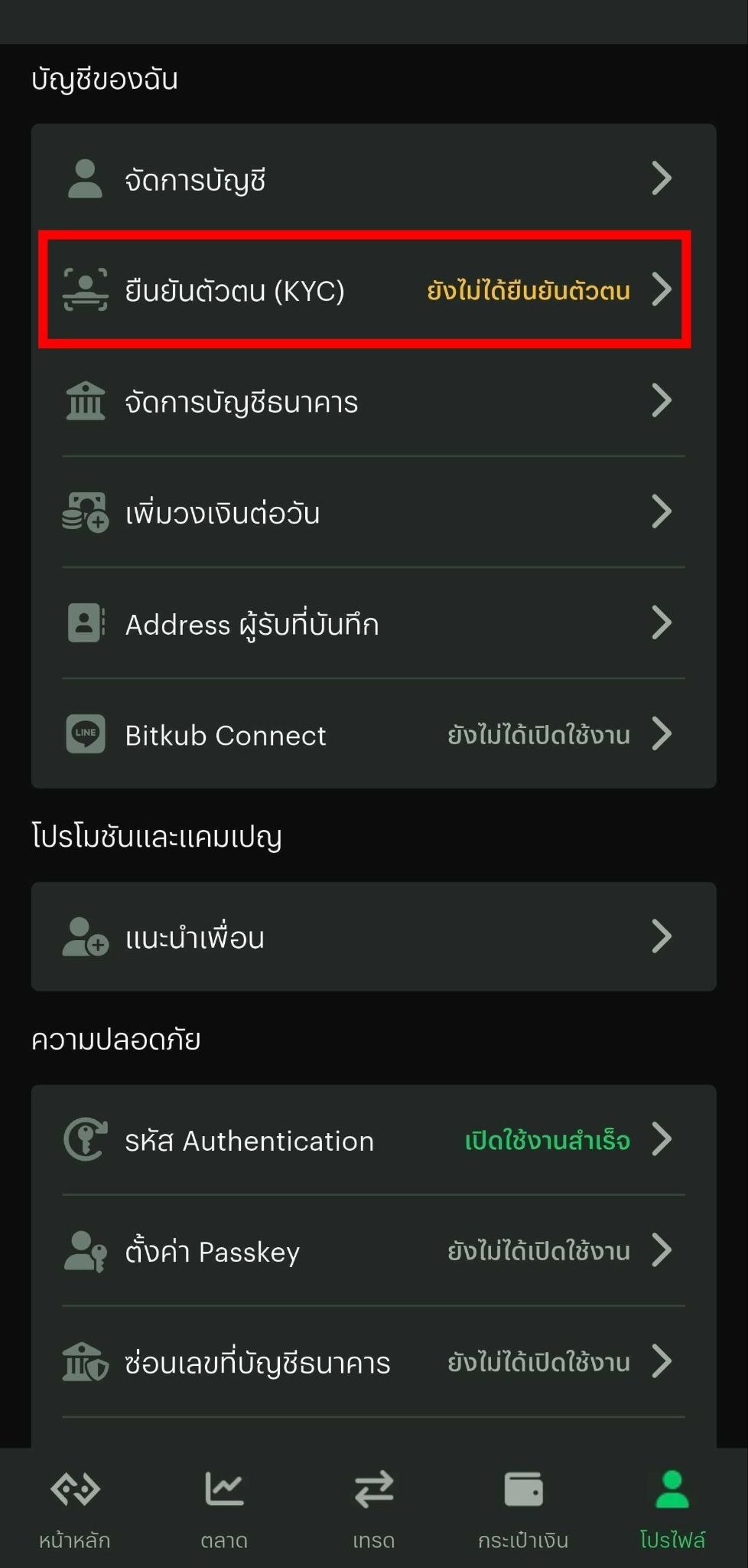 3.2 กดเลือกเมนู "โปรไฟล์" ที่แถบเมนูด้านล่างขวา และเลือกหัวข้อ "ยืนยันตัวตน (KYC)"