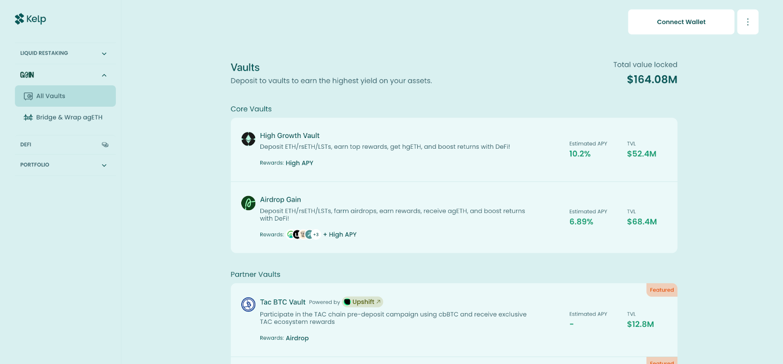 Gain (Automated Yield Vaults) นำเสนอ Vaults การเพิ่มประสิทธิภาพผลตอบแทนแบบ non-custodial ที่ซับซ้อน ซึ่ง Vaults จะทำให้การทำฟาร์ม การ Stake และโอกาสการ Airdrop ที่ซับซ้อนเป็นไปโดยอัตโนมัติ ทำให้กระบวนการสร้างรายได้แบบ Passive Income ง่ายขึ้น โดยได้รับการออกแบบมาเพื่อเพิ่มผลตอบแทนสูงสุดโดยการปรับใช้สินทรัพย์ในโปรโตคอลต่างๆ ซึ่งนำเสนอวิธีที่ใช้งานง่ายในการนำทางกลยุทธ์ DeFi ที่หลากหลาย