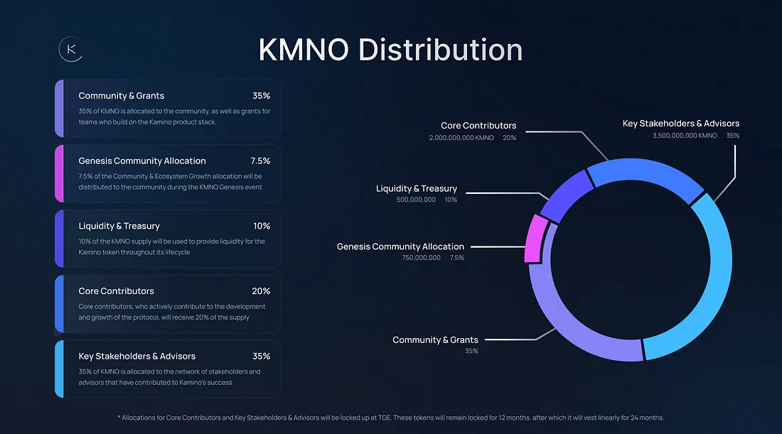 ผู้มีส่วนได้ส่วนเสียหลักและที่ปรึกษา: ประมาณ 35% สงวนไว้สำหรับพันธมิตรเชิงกลยุทธ์และที่ปรึกษาที่มีส่วนร่วมในการเติบโตและความสำเร็จของ Kamino โทเค็นเหล่านี้มักจะอยู่ภายใต้ตารางการปลดล็อค (เช่น ล็อค 12 เดือน ตามด้วยการปลดล็อคเชิงเส้น 24 เดือน) เพื่อให้มั่นใจถึงความมุ่งมั่นในระยะยาว