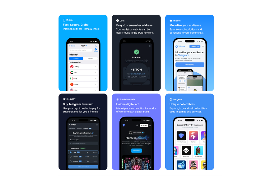 และ TON DApps เป็นแพลตฟอร์มสำหรับนักพัฒนาในการสร้างและใช้งาน dApps เป็นการผสมผสานระหว่าง TON Virtual Machine (TVM), โครงสร้างพื้นที่สำหรับการปรับขนาด และฐานผู้ใช้งานจำนวนมากเป็นการเปิดโอกาสสำหรับการพัฒนานวัตกรรม เช่น การพัฒนา dApps สำหรับ DeFi, การสร้างบล็อกเชนเกม, และการสร้างโซเชียลมีเดียแบบกระจายอำนาจเพื่อส่งเสริมความเป็นส่วนตัวของผู้ใช้งานและความสามารถในการเป็นเจ้าของข้อมูล
