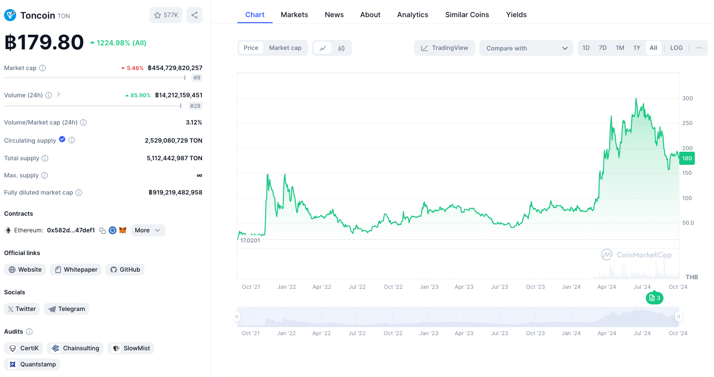 ณ เวลาที่เขียนบทความนี้ เหรียญ TON ซื้อขายกันอยู่ที่ราคาประมาณ 5.50 ดอลลาร์ 179.80 บาทต่อ 1 TON โดย TON เคยทำราคาสูงสุด (All-time High) ที่ 8.24 ดอลลาร์ หรือ 269.41 บาท ต่อ 1 TON เมื่อวันที่ 15 มิถุนายน 2567