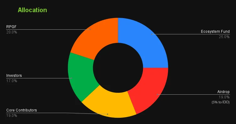 19.00% สำหรับการทำ Airdrop โดยแบ่งออกเป็น 5% จะถูกจัดสรรให้กับ Initial DEX Offering (IDO)