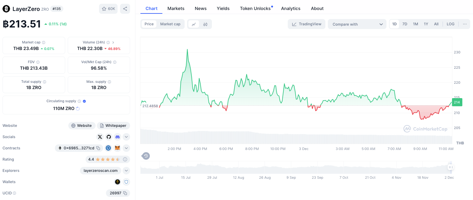 ณ เวลาที่เขียนบทความนี้ เหรียญ ZRO ซื้อขายกันอยู่ที่ราคาประมาณ 6.22 ดอลลาร์ 213 บาทต่อ 1 ZRO โดย ZRO เคยทำราคาสูงสุด (All-time high) ที่ 6.82 ดอลลาร์ หรือ 234.98 บาท ต่อ 1 ZRO เมื่อวันที่ 2 ธันวาคม 2567
