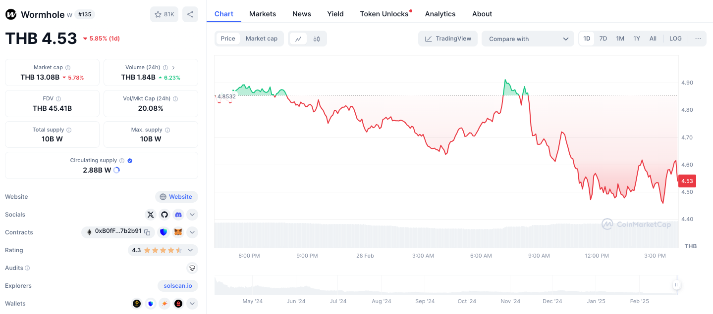 ข้อมูลจากเว็บไซต์ Coinmarketcap เมื่อวันที่ 28 กุมภาพันธ์ 2568 เหรียญ W มีมูลค่าตามราคาตลาด (Market cap) ที่ 388,846,956 ดอลลาร์สหรัฐฯ หรือประมาณ 13,088,781,514 บาท