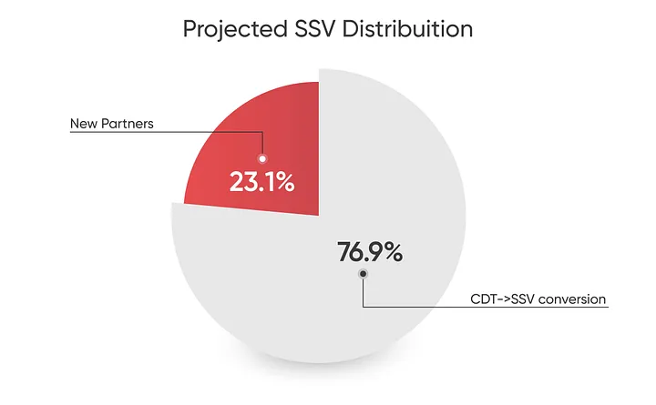 นับตั้งแต่ ssv.network ก่อตั้งขึ้นเมื่อปี 2564 จำนวนโทเคนที่เดิมอยู่ในรูปของ CoinDash Token (CDT) จากนั้นเปลี่ยนชื่อมาเป็นมาเป็น Blox.io ในเวลาต่อมา ได้ทำการอัปเดตโทเคน CDT ทั้งหมดสามารถแลกเปลี่ยนเป็น SSV ได้ในอัตราส่วน 1:100 แบ่งออกเป็น 3,000,000 SSV สำหรับ DAO, แบ่งไว้สำหรับพันธมิตรทางธุรกิจ และต่อมาหลังจากมีการอัปเกรดโทเคนอีกจำนวน 13 ล้าน SSV ถูกสร้างและกระจายตามสัดส่วนที่กำหนด ดังนี้